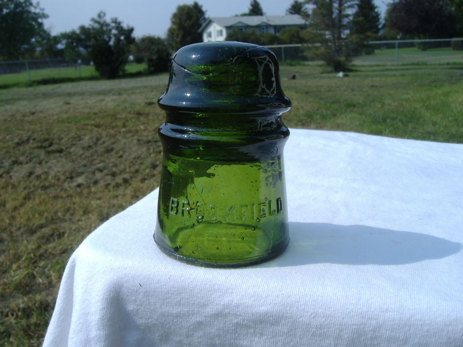 This insulator is a CD 121 embossed on the front; "BROOKFIELD" with an "XO" on the dome and 5 blots on the back. This is the [030] listing in the book. It is a dark yellow green color. The insulator is in excellent very near mint condition with no chips or cracks. Priced at; $35.00 plus shipping. Payment by PayPal friends & family or check. Thanks. |