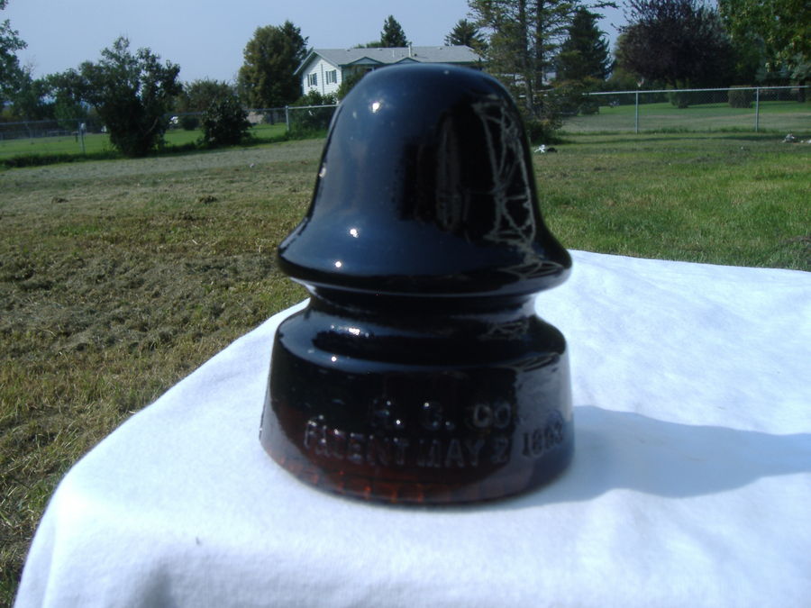 This insulator is a CD 162 embossed on the front; "H. G. CO. PATENT MAY 2 1893" and "PETTICOAT" on the back. It is a deep root beer amber color. The insulator has a dome peck mark with an associated thin flat 1/2" flake, another dome peck mark on the LH side, a 1 1/2" chip and base bruise on the back base, and 4 other flaked drips. It does display nicely from the front as shown in the photo. Priced at; $65.00 plus shipping. Payment by PayPal friends & family or check. |