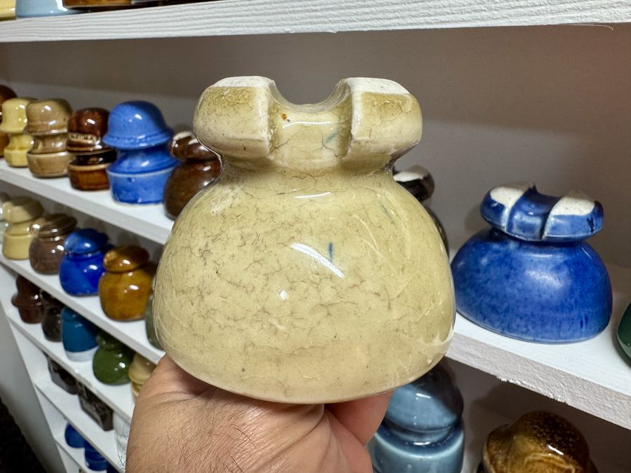 | Here's your chance to own a super rare early dry process cable you never see for sale in cream yellow with a few blue spots in the glaze. Elton's guide says there's 5 known. All I see wrong with it is a tiny flake on the sharp edge of the saddle groove and a line on the bottom where it bumped into something and soot soaked into the line. Ask for more photos. $600 plus $20 for shipping and insurance. Elton wrote these U-562 dry process insulators were made around 1905 by the Barberton Pottery Co., which reorganized in 1906 as the Akron Hi-Potenial Porcelain Co. In July 1907, Ohio Brass took control of the company's full production after it was converted to wet process porcelain and controlling interest was acquired in May 1910. The ink blue and pale yellow U-562's are rare! |
