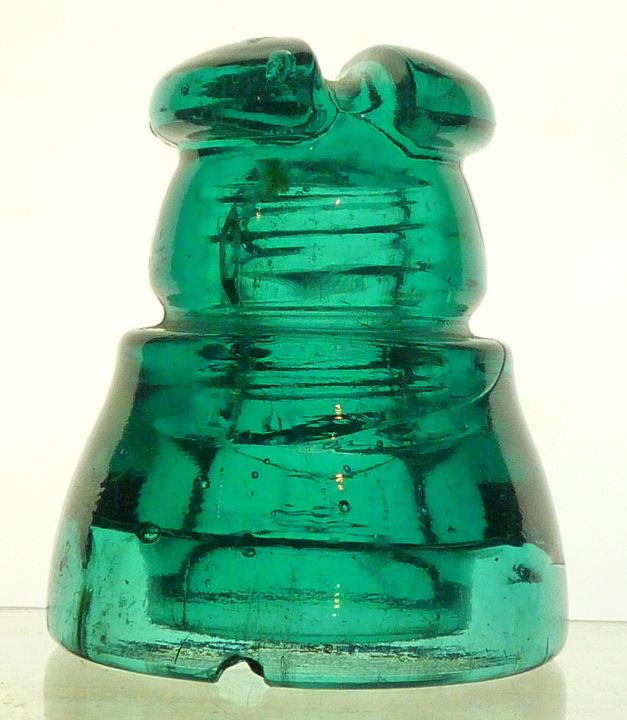 CD 210 POSTAL telegraph insulator. For those who prefer the "crude manufacture" of the glass made by the "BROOKFIELD BOYS". For those seeking perfection....now is the time to go to the next item. A beautiful CD 210 POSTAL TELEGRAPH insulator. DARK AQUA. MLOB. POSTAL embossed on one ear. Overall condition is very nice with no real distractions to note. Parts of the original inner skirt vent teats still intact. If you are a fan of oddities produced by BROOKFIELD, this piece may be just what you want. As nice as it is, here is what makes it stand out from a typical piece. There is is small open base bubble (see photo). Wisps of steam in the ears. And then the coolest part......an open bubble from the wire groove to the bottom of one of the ears !!!! (see photo). How cool is that !!!. Just to be also noted. A 1" vertical thermal crack in the skirt below the open bubble in the middle of a patch of light steam. WHOA BABY !!!!! Don't you know this would be a nice addition to what you already have ? And, just noticed, a small "goober" in the dome under one of the ears. Get all of this excitement delivered to your address... $15.00 + shipping Stock #a4109 |