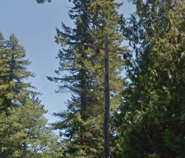 Mike Parker showed me this line (I believe this was at Rose Lodge, OR in front of a store) when I went out west to visit him before the Portland National, and he said it was the last remaining example of this type of Mountain States Power line construction - pairs of 10" disks suspending a 22kV line instead of large bowls or small multis. After Pacific Power took over in 1954, the old 22kV system was bumped down to 12.47kV distribution, and most of the old MSP-era construction has since disappeared in line rebuilds through the decades. |