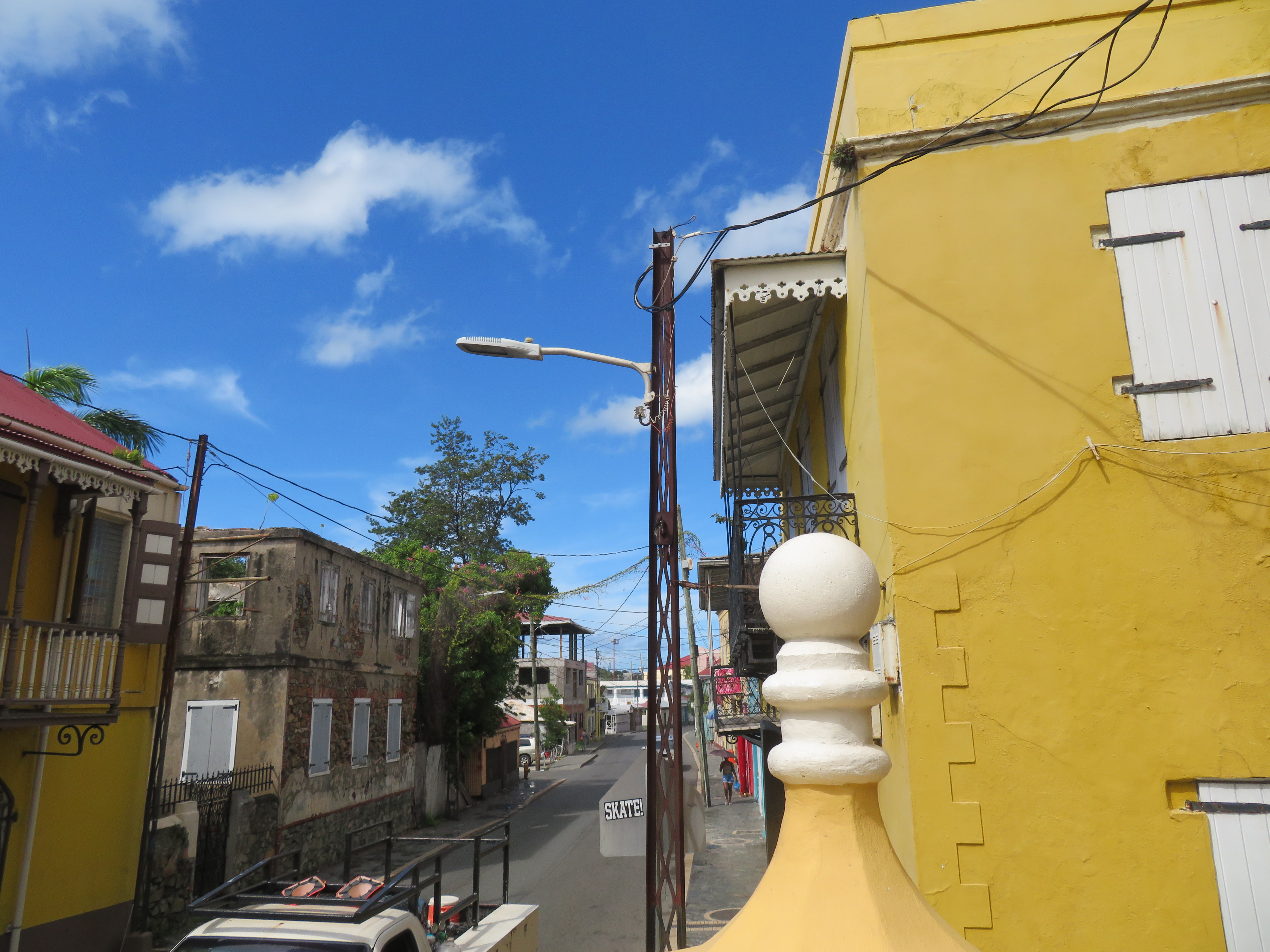 Charlotte Amalie, Saint Thomas, US Virgin Islands had old steel poles throughout the old town with a variety of insulators. Picture taken from Saints Peter and Paul Cathedral.