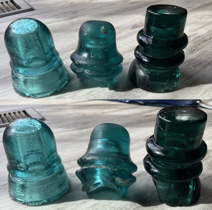 The 742.3 just has the usual base nibbling and some skin-deep thermal stress lines = $400. The 718 is a specimen, missing most of the skirt = $300. The 736.1 is a nice greenish color and is missing most of the skirt = $200. (or $800 for all 3).