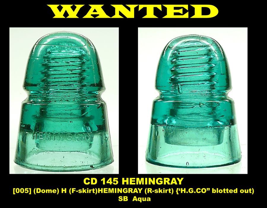 Have only seen and handled one of these. One came through the Springfield show 5 or 6 years ago. CD 145 EIN [005] Front skirt embossed: HEMINGRAY Rear skirt embossed: " H.G. CO " blotted out Top of dome: H Smooth base Aqua Got to be more out there. Check your inventory. Find one. Bring to Springfield or contact me |