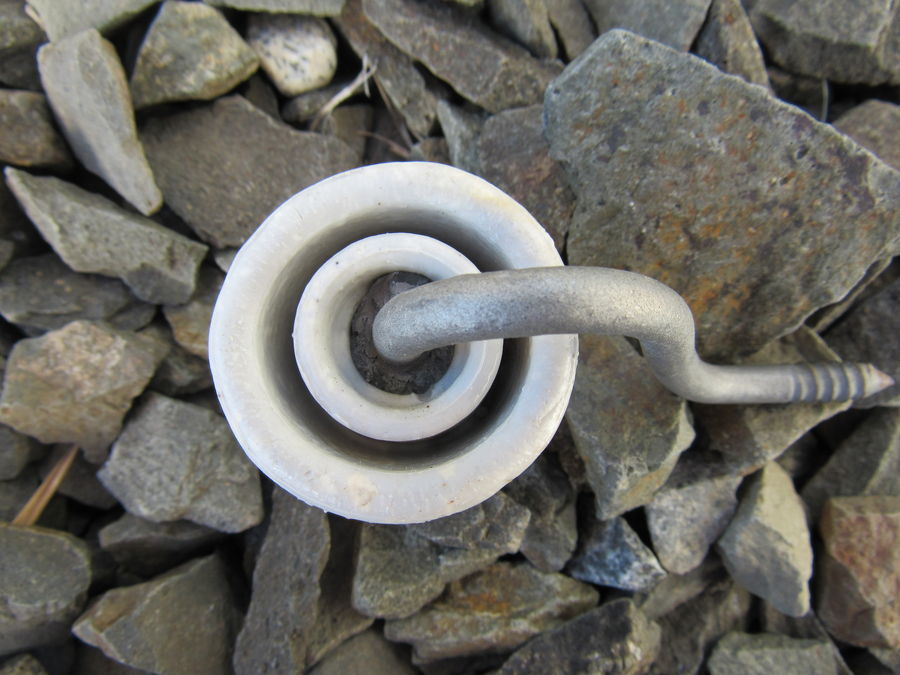 Got this no tie insulator out of the Bob Scafe collection. Most likely European. Measures 1 5/8" base, 1 5/16" top, 1 3/4" tall. Galvanized J hook is epoxied in.