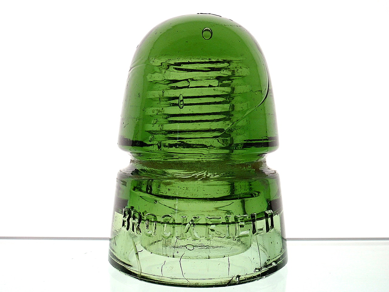 Deep yellow green CD 145 BROOKFIELD with a large OX on the dome top. Four pencil lead point ticks, rear base edge 5/16" flake, heavy conductor wear in the wire groove and a 3/4" front skirt annealing line are the only flaws. Clean clear glass! $ 45.00 includes shipping. |
