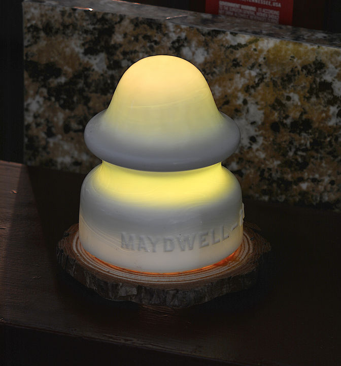 Situated on a 5" disc of pinewood, w/bark! Warm white C7 LED allows the greenish glow to show. I have another identical one the other end of the cabinet.