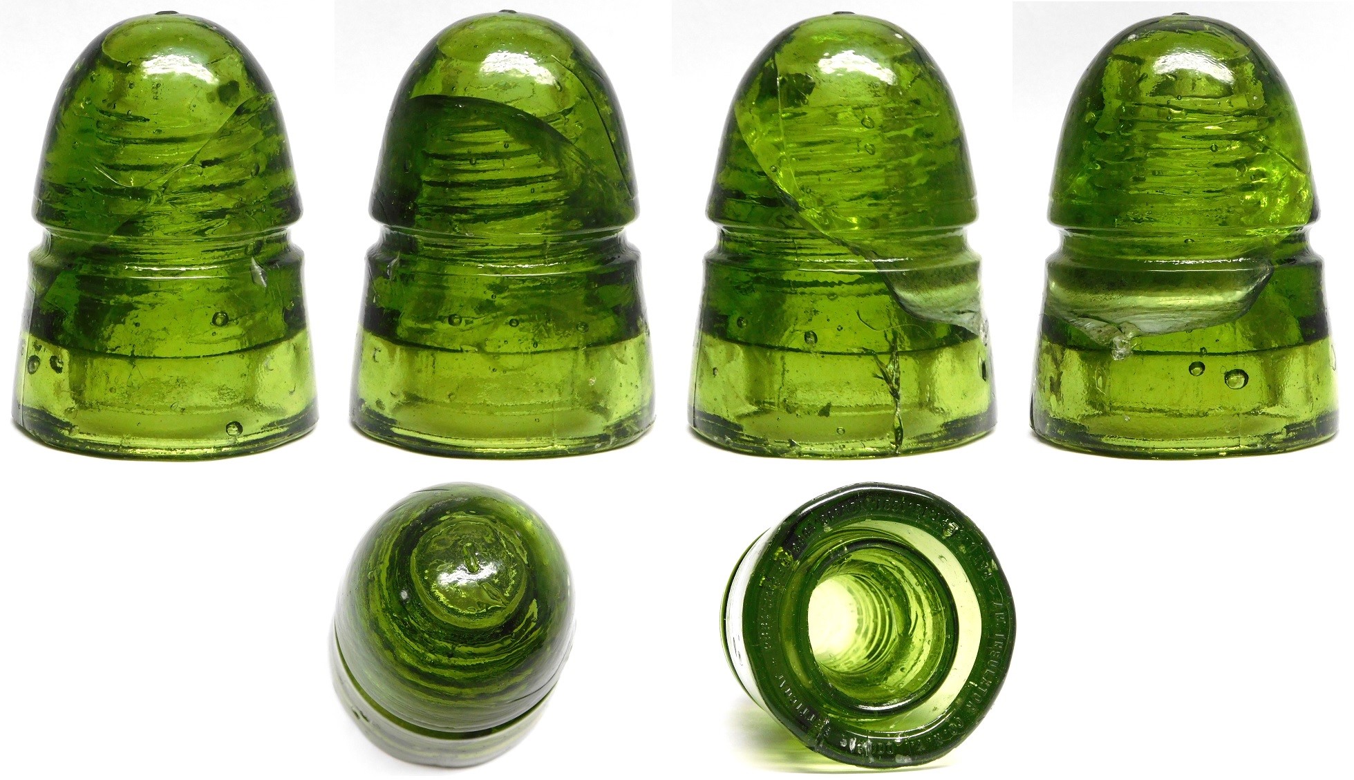 Here is CD 145 EIN [020] (Dome) I (Base) [4 tiny diamonds forming a diamond] AM. INSULATOR CO. N.Y. DOUBLE PETTICOAT/[4 tiny diamonds forming a diamond] PAT'D SEPT. 13, 1881, NOV. 13, 1883, FEB. 12, 1884 BE in Yellow Olive Green. It has the obvious impact fracture as well as a 1+" stress crack up from the base and a couple of pecks. On the plus side, it has several bubbles, a milky wisp, and that glowing color. Price Guide value for vnm is $1,250–1,500. Final reduction: $200 shipped in the U.S. CK/MO. |