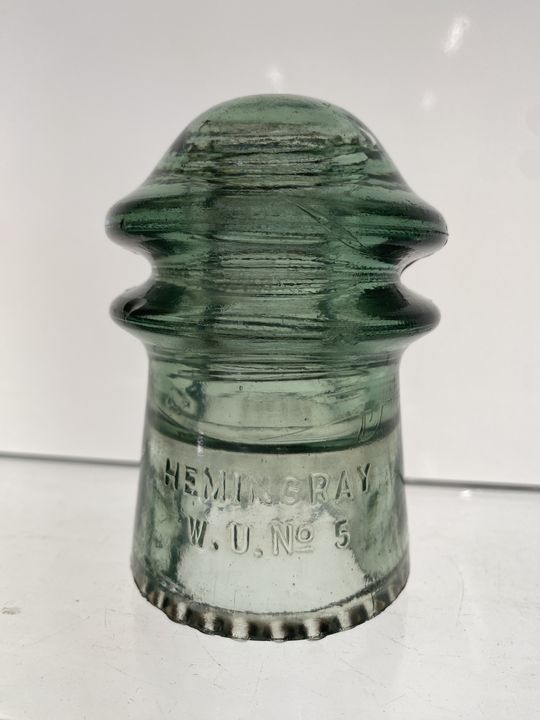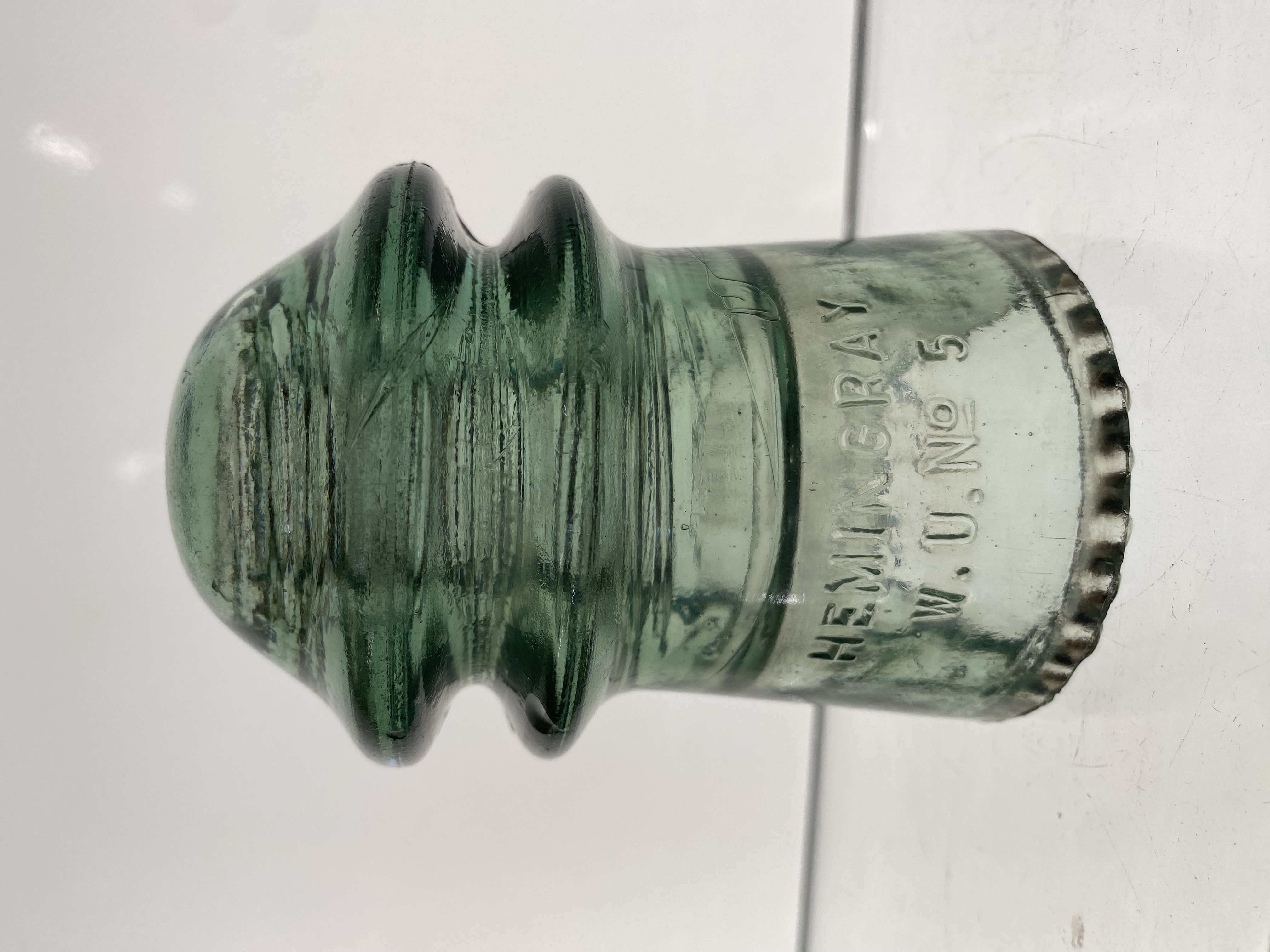 CD 125 Hemingray, W.U. No 5 / patent May 2, 1893 with sharp drip points in vnm condition, couple of 3/16" flakes lower wire ridge. Very nice sage green color. $200 includes shipping in U.S.