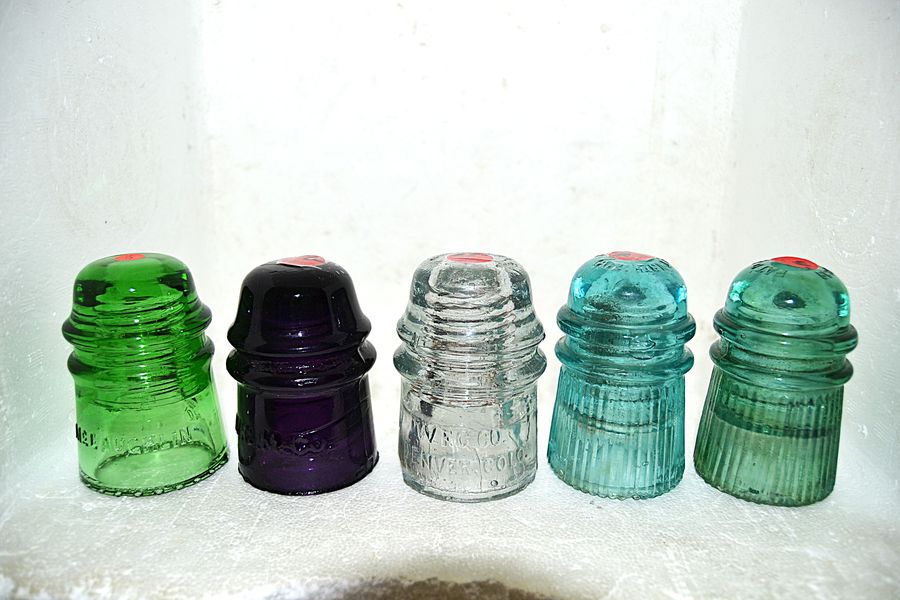 Left embossed McLaughlin and rear skirt No 16 - Round drips - See no flaws but will classify VNM - Yellow green $40 (SOLD) - 2nd Embossed W.G.M.Co. - Royal purple - Base nicks on base $38 - 3rd - W.F.G.CO Denver Colo. rear skirt 16 - Off clear - 1/2 inch base chip and some annealing cracks in threads - $28 - 4th Dome embossed Pat'd Sept. 19th 1899 - Aqua - 3 drips have bruises and one drip slivered $38 - Right Same as previous - Green Aqua - Base roughness all around base $38 plus shipping |