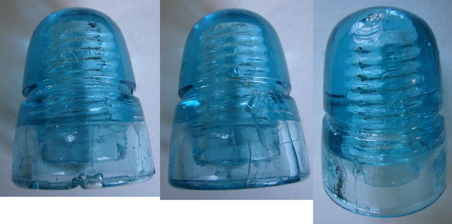 CD 145 { front skirt } arc: W. BROOKFIELD / 45 CLIFF ST. / N.Y. {rear dome} 2 / {Rear skirt} PAT. / JAN. 25TH 1870. I call it Lite Sapphire Blue - Windex Blue, you judge. Has a fluted skirt flake to the wire groove in front, and dome ping in back. $100. + postage. |