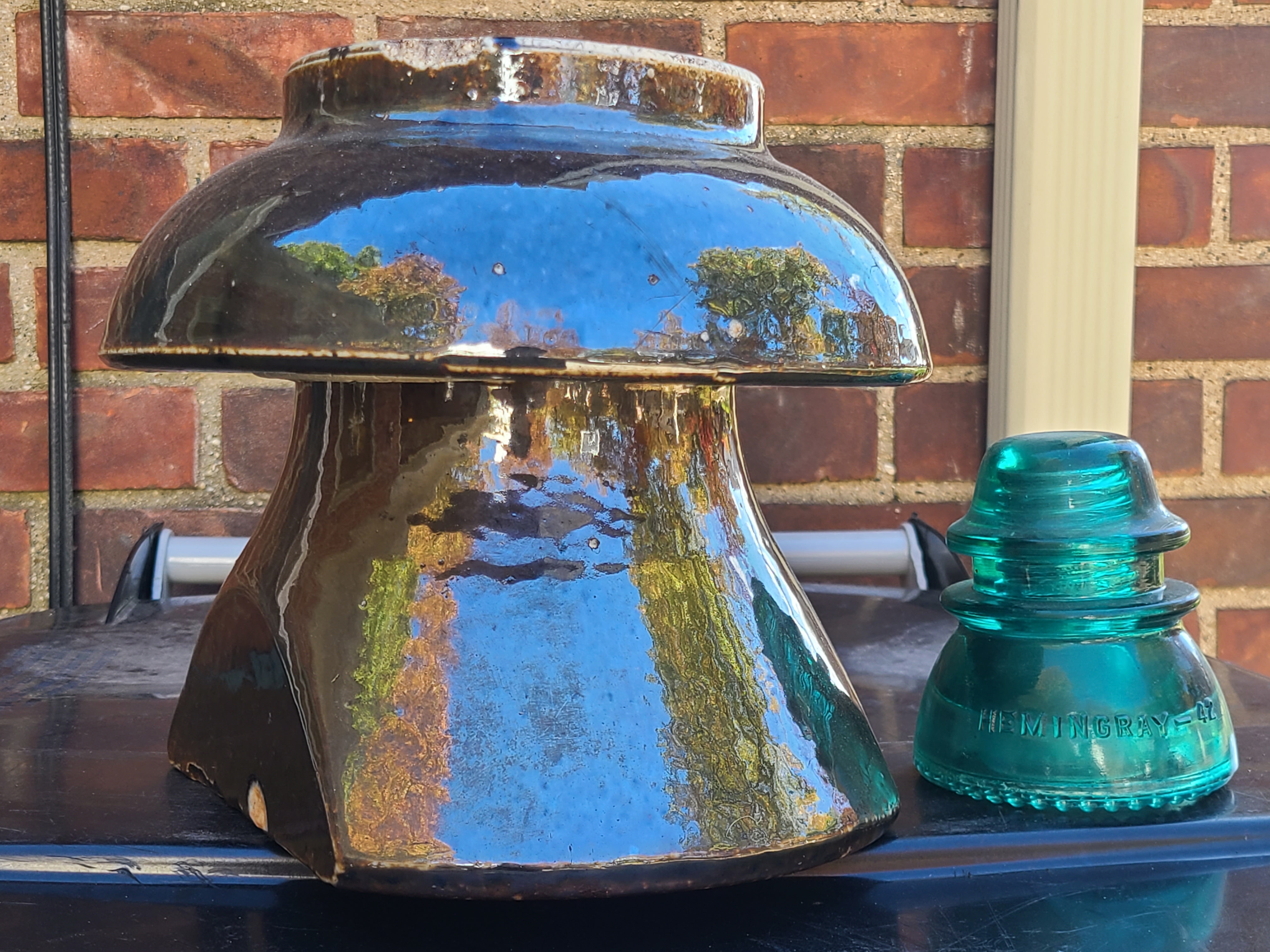 Cool and historic large Ohio Brass 3rd rail insulator, I'll be at Springfield and can deliver it. These were used on an interurban line by Kalamazoo Michigan, I forget the exact age, but I believe around 1910's. This insulator is above average for condition, most have lots of large chips. This example does have some smaller chips, but still very nice. Asking $65. |