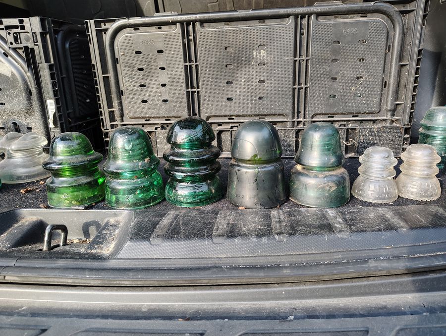 Here are some green pieces from my purchase [id=766177460]. Sadly, the emerald CD 205 has some big cracks in it. Nice green and olive Star signals, an olive B Beehive, and a green PRR. Also 2 Surge insulators.