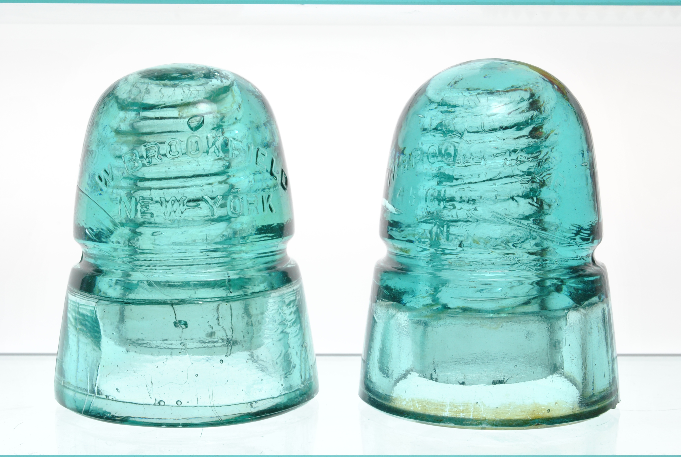 LEFT: EIN170 uncommon shop letter A. While this insulator is the typical aqua color, it has a lot of character. There is a nice skirt bubble on the patent date side, along with some nice light ribbons of milk. The patent dates are 1883 for the double petticoat (the skirt within the skirt). And 1884 for the beehive shape. I was told by a speciality collector that the 1884 patent was actually defeated in court, but here it is embossed on every insulator produced. I find a lot more of the Letter B than I do the A. $18 plus shipping. RIGHT: CREBB EIN090 Rare SN 5 This one is a blue aqua. There are five one quarter inch long annealing lines on the inner petticoat (visible in the photo). The insulator is still VNM. $25 plus shipping. Take the pair for $38 plus shipping. |