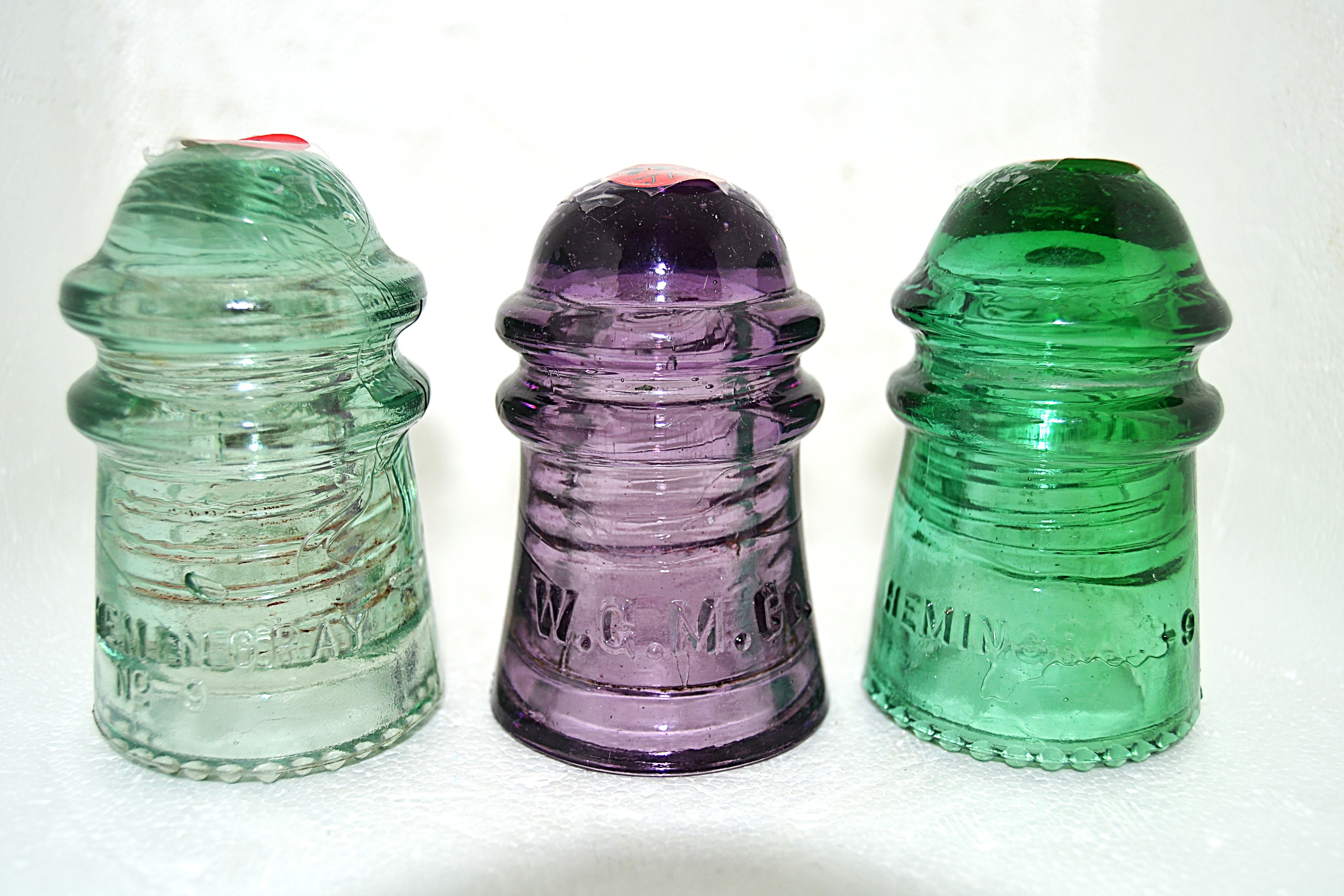 Left Embossed Hemingray No 9 and rear skirt Patent May 2 1893 - Sharp drips, on back every other drips are long while the others are short. - Color is a lite green or celery - One drip slivered - $125 - Middle embossed W.G. M. Co. - smooth base - royal purple - very thin base sliver about 1/4 inch, not visible displayed $70 -- Right -- Hemingray -9, rear skirt Made in U.S.A. - Green - One super small prick on base. $25 plus shipping. Three photo's included. |