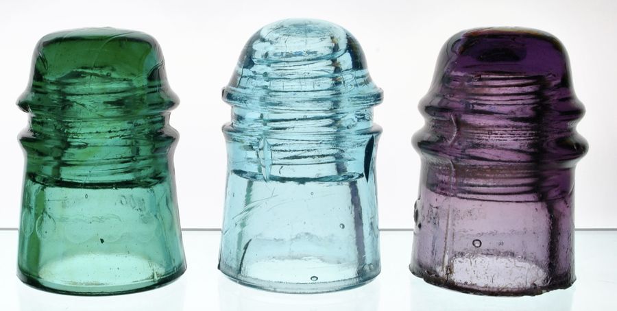 I used the phoenitic spelling for each of the manufacturers. LEFT: BROOKFIELD X2 on dome green aqua with light amber and six blots on the back skirt. EIN030. There are three small wire groove nicks (small chips) and one small bruise. There is light amber thought the insulator. CENTER: Unembossed Duquesne with four ribs. There are no chips but there are very shallow outer surface annealing lines (cracks) on the dome. There are two inside annealing lines (cracks) on the inside skirt, both about an inch long. RIGHT: Medium purple W.G.M. Co. There is a nice little bubble right over the embossing. There is some stubborn rust on the back of the insulator which I never removed because I liked the color it added to the insulator. The flat thumb chip is about 1 inch long, but it continues in the very center of the base for another half inch. So it is 1.5 inch long over all. There is another pinky nail size chip. Unlike most base chips it does not interfere with the display appearance. $38 plus shipping |