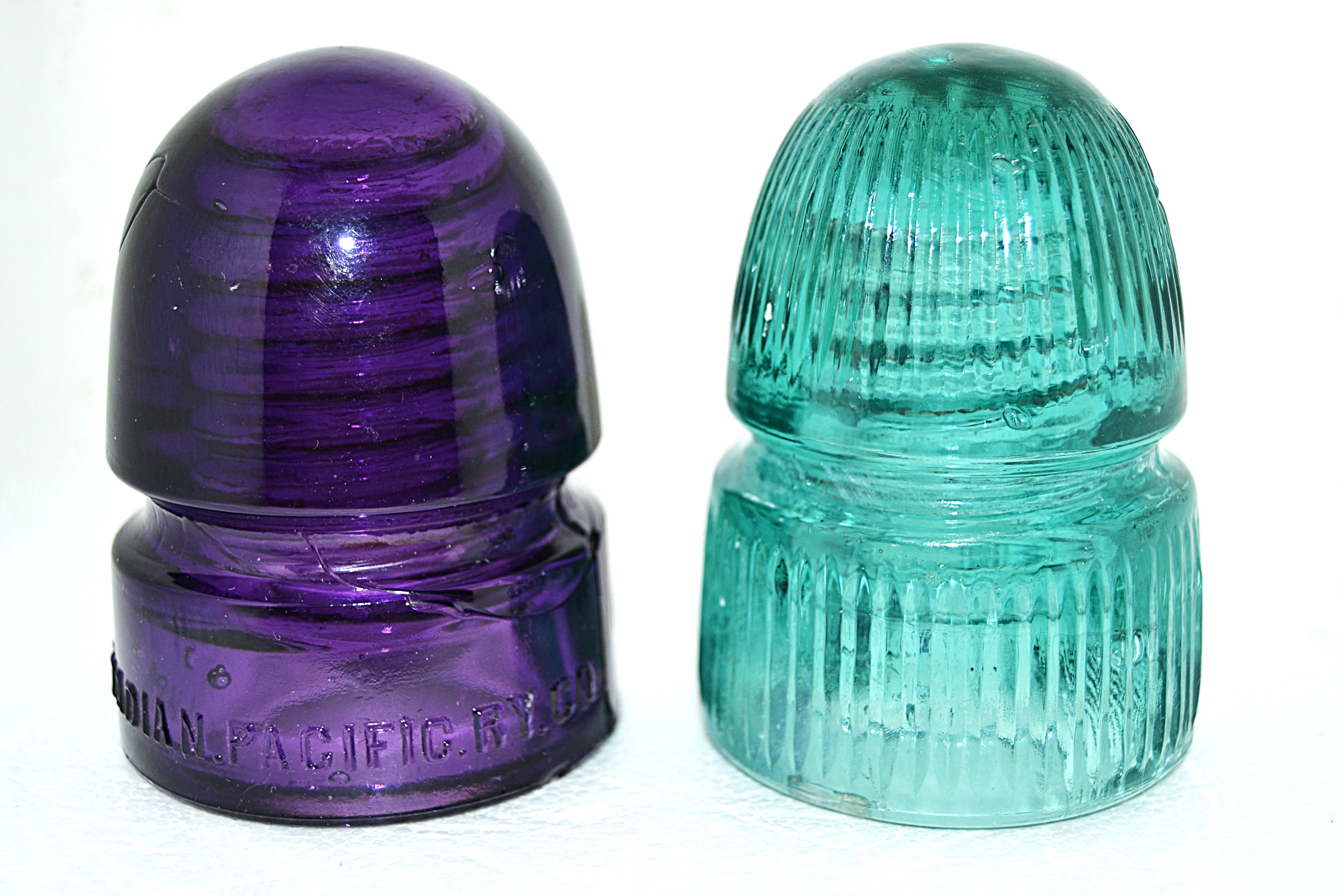 Left is a CD 143 embossed Canadian Pacific RY Co. - Royal purple - One pinhead prick on dome, slight open air bubble on base - $100 --- Left - CD 143 no embossing - Aqua - vertical ridges - Bruise at wire groove and a open air bubble on base - $95 plus actual postage. |