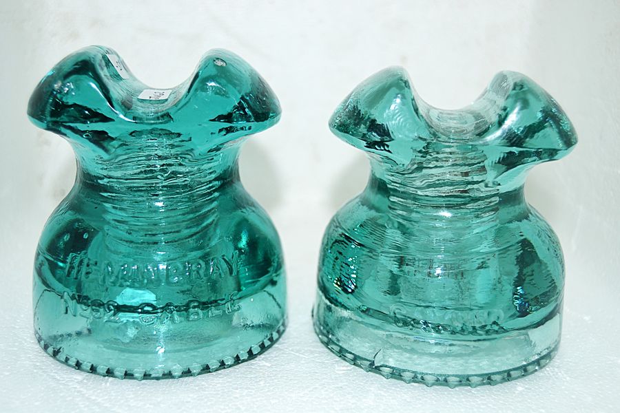 Left is embossed Hemingray No 62 Cable and on rear skirt (blotted out Knowles Cable) Pat. 2nd 1893 - Sharp drips - Blue Aqua - Small chip on base which removes on drip, one other drip flaked and several BB dings on ears - $12 --- Right embossed Gayner and on rear skirt No 820 - Sharp drips - aqua - Bruise on back which damaged several drips and one other area where one drip in slightly flaked. $18 plus actual shipping. |