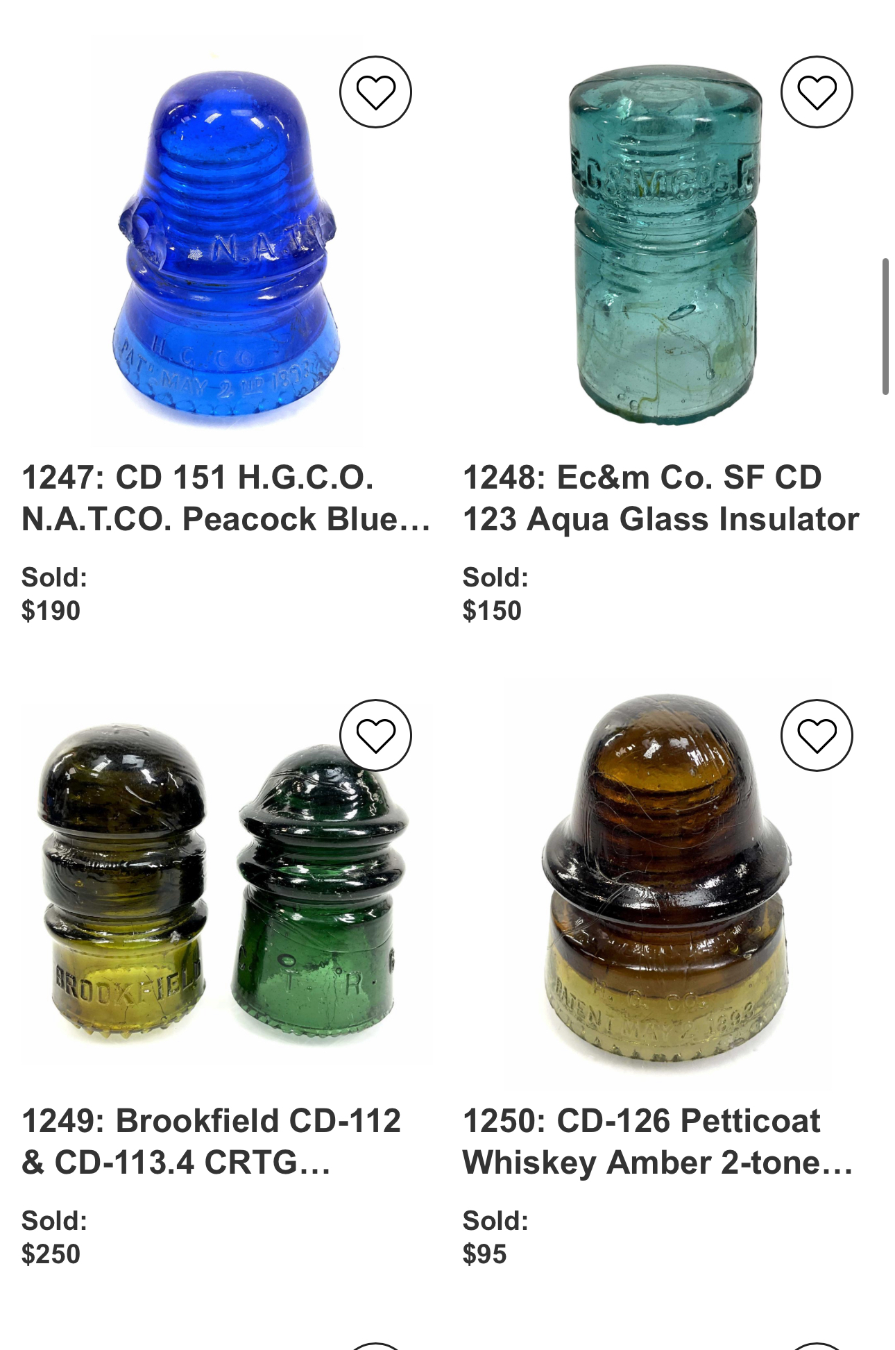 More of Tommy Bolack's insulators were up for auction today. Some highlights included a chipped up Peacock Blue CD 151 HGCo NATCo, an aqua CD 123 EC&MCo., a two tone amber CD 162 HGCo, a beautiful but chipped green CD 113.4 CTRG No.9 and a pretty dark olive amber CD 112 Brookfield |