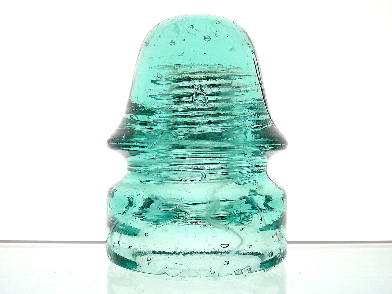 Super tough to find!! CD 134 [010] no embossing Canada. Bubbles and milk swirls add character. Sparkling clean light aqua. Three pencil lead point ticks, three micro half matchead base flecks and some inner base edge day one mold removal roughness are the only flaws. $ 115.00 includes shipping. |