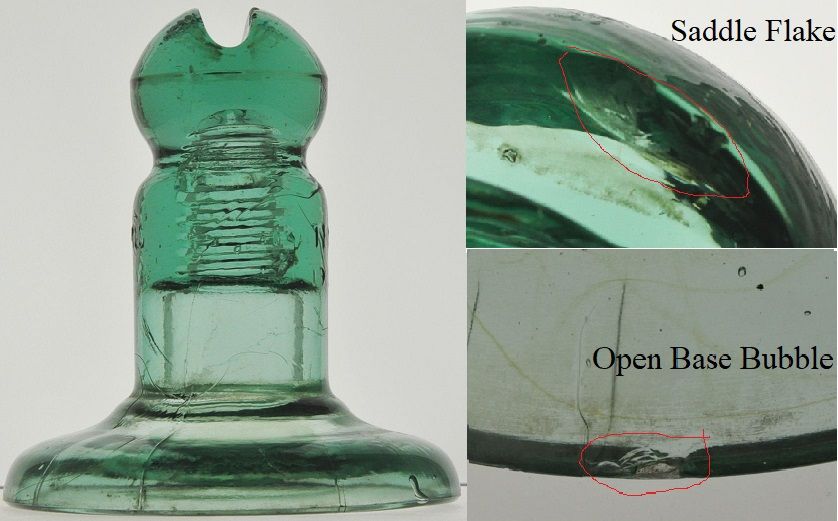Chambers CD 317 [010] Light Green (leaning towards lime green) with some very minor amber swirling This insulator is a beautiful example of the "Candlestick" in a great color and with very minor damage. There is a 1/2" shallow flake inside of the saddle groove (upper right photo) and an open bubble on the base edge with very minor chipping (lower right photo). It displays very nicely. Was asking $1100 including shipping and insurance in the USA, but will take $1000 I will accept a check or prefer PayPal – Friends & Family. |