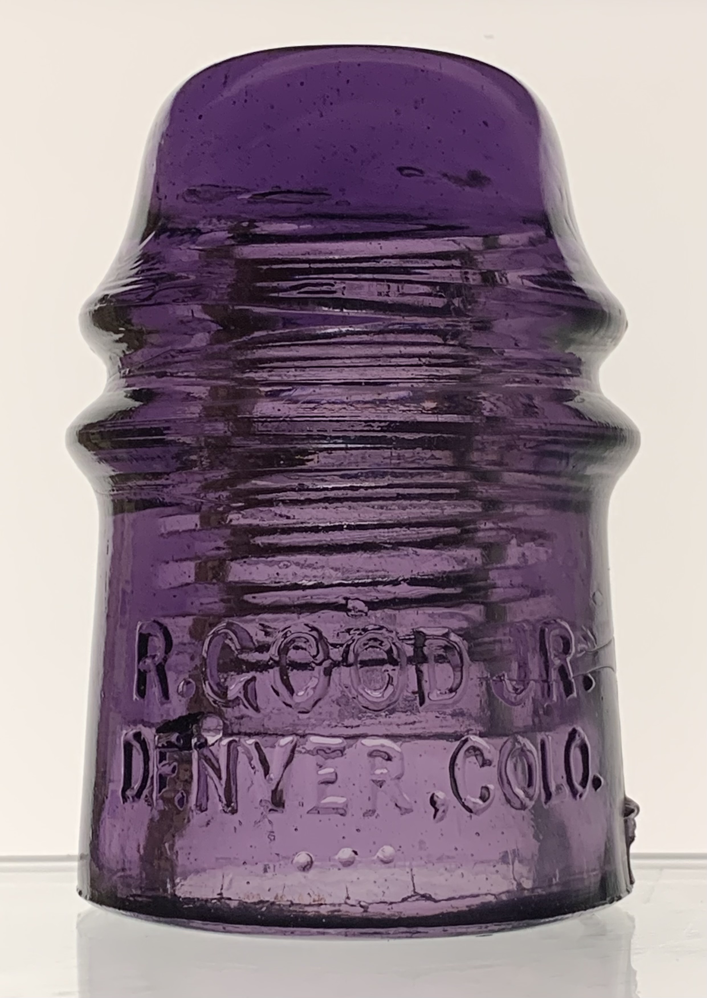 What a nice purple R. Good Jr. toll! The medium purples are actually not that easy to find, and especially in such good condition. I see one one-third of a pinky nail flat base flake and minor roughness along the base mold line, but that's it. Displays perfectly mint. This has none of the frequently found annealing lines, either. It's one that Robert Good, Jr. himself would approve of being shipped from Valverde. If you've been looking for a nice purple GOOD for reasonable price, here's your insulator! I'm asking $300 shipped, PayPal F&F only please! |