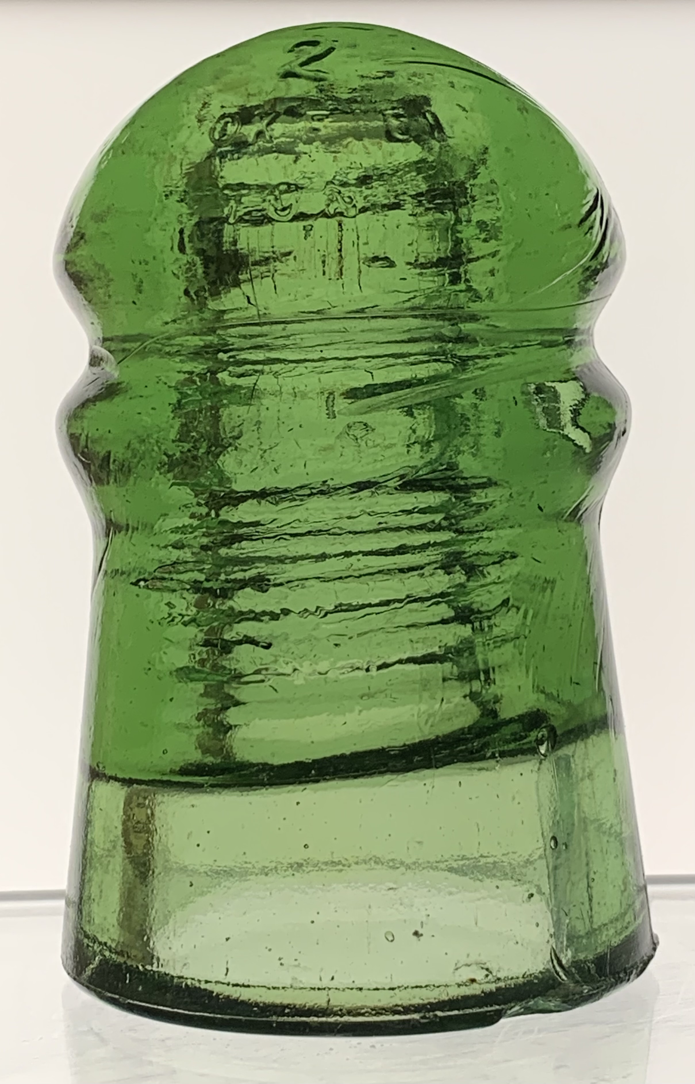 Here's a nice W. BROOKFIELD, 55 FULTON ST. CD 126 CREB for you. Only flaws I see are a half pinky nail sized base edge flake in front and an inconspicuous, totally in-glass 1 1/2" long fracture on the Patent date side, mid-skirt, emanating from the threads, probably from being aggressively screwed onto the threaded pin. Decent embossing on this one - mold # 2. Nice colorful early Telegraph glass. This one can be yours for $200 shipped, PayPal F&F only please! |