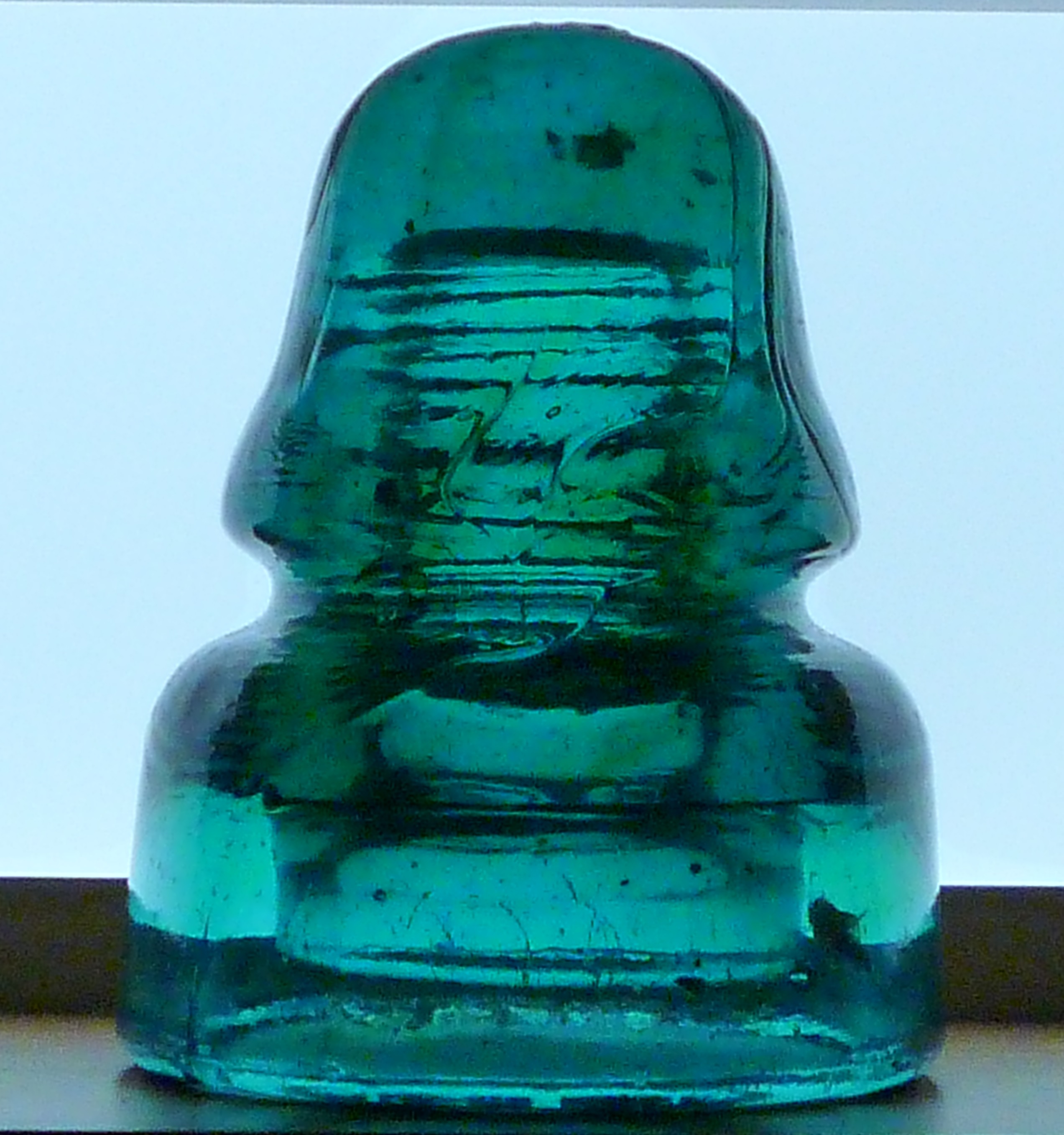 CD 162.5 P.R.R. telegraph insulator. Top of dome: P.R.R. Front skirt: B DARK AQUA. Nice condition with only a couple annealing lines in the skirt and threads. No other distractions to note. Smooth base.