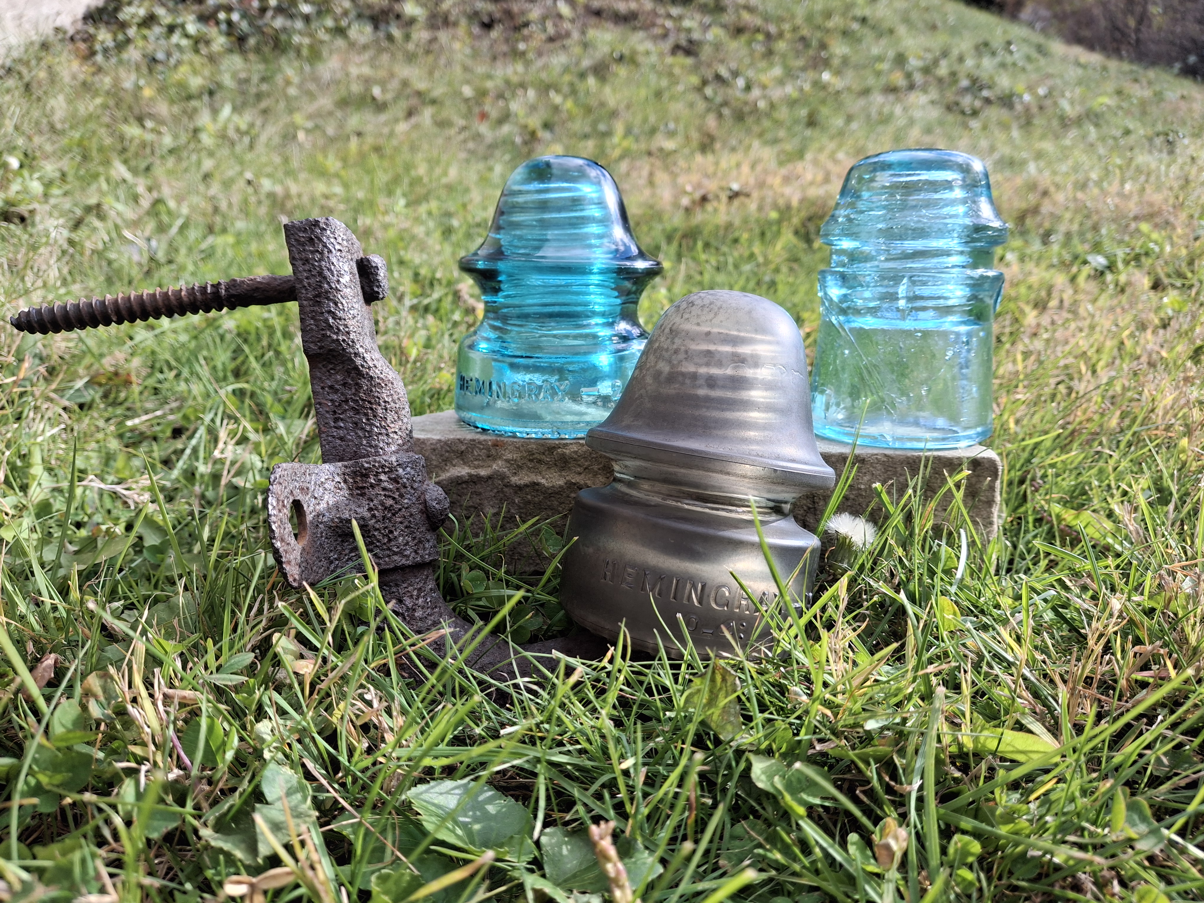 The clear CD 134 Hemingray No. 18 with its original bracket is from Clairton, Pa. The unembossed Duquesne CD 121 and the Hemingray CD 164 are from Mckeesport.