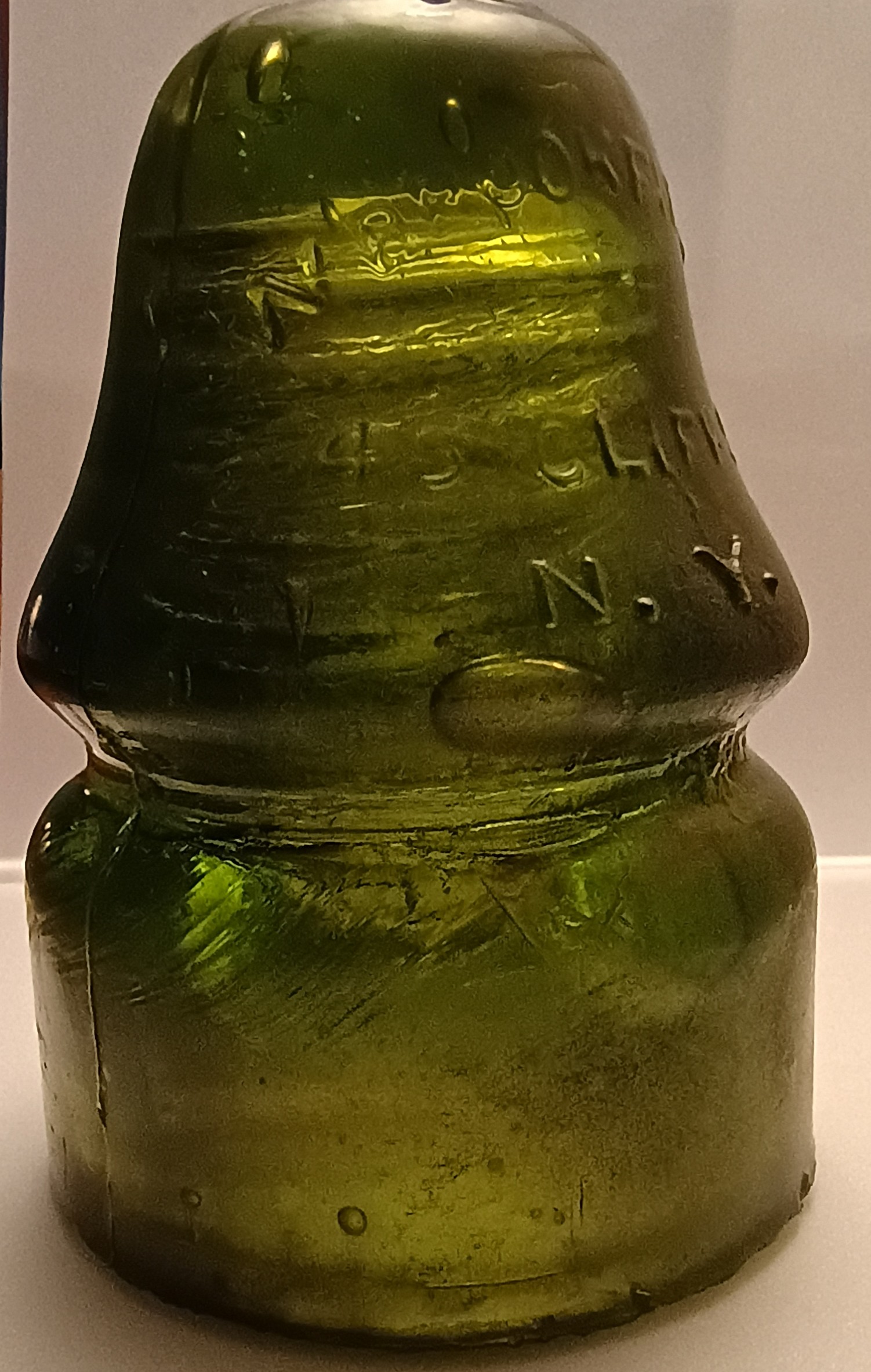 Here is a beautiful colored CREB 133. Color is yellow-green/light olive-green, and the condition is incredible. You'll see this color on a 126 CREB a dozen times before you see it on a 133 CREB. Appears mint at first, but after handling it about 5 or 6 times i discovered the smallest of flakelets on base edge, a pinhead flake, bot resulting from the chattering to the sharp mold edge on base. This one would be a good candidate for a light tumbling. Glass is hazy in spots, and some soot in the wire ridge and on skirt. Nice oval-bubble,....and a larger 1.5 in stretch-bubble in skirt close to the bottom of the wire ridge. This is the variety W.Brookfield in arch on dome, with 45 Cliff st./N.Y. under it. On rear is "PAT." in arch, with June 25, 1870 under it. This side is extremely difficult to see however......while the Cliff st. side is highly visible. Shop #10 on top. Looking to put some dollars with this and trade for my first(and only) milky-aqua CD 257 i would also consider trade for other CDs that are Hemingray, with character |