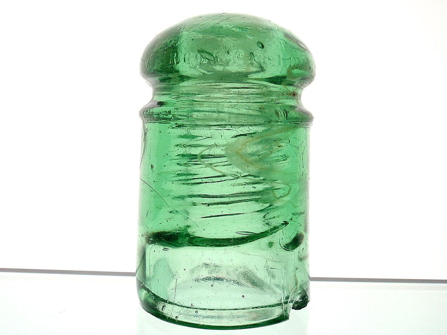 Much coveted early color telegraph! Mucho milky olive swirls in this DARK lime green CD 127 [080] version with a large wide "H" above the rear embossing. Front side base open bubble flake, 1/8" wire ridge flake, wire groove wire rub, matchead base flake, the flat base bruise you can see in pic # 2 and the crown / lower wire ridge bruise you can also see in pic # 2 is the damage report. Easy $ 1000.00 piece without the damage. Can be yours for only $ 295.00 shipping included. Let's try $ 240.00 shipped to you. |
