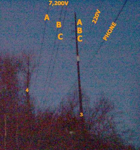 here's where all the lines are away from the pole, you can't really see the rope running but its there. Sorry the pics look bad but they where taken all at night. NOTE: where it says phone i mean cable, the phone line was down on this pole. Sorry!!!!! |