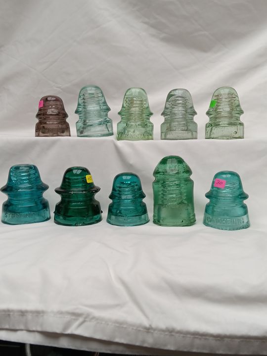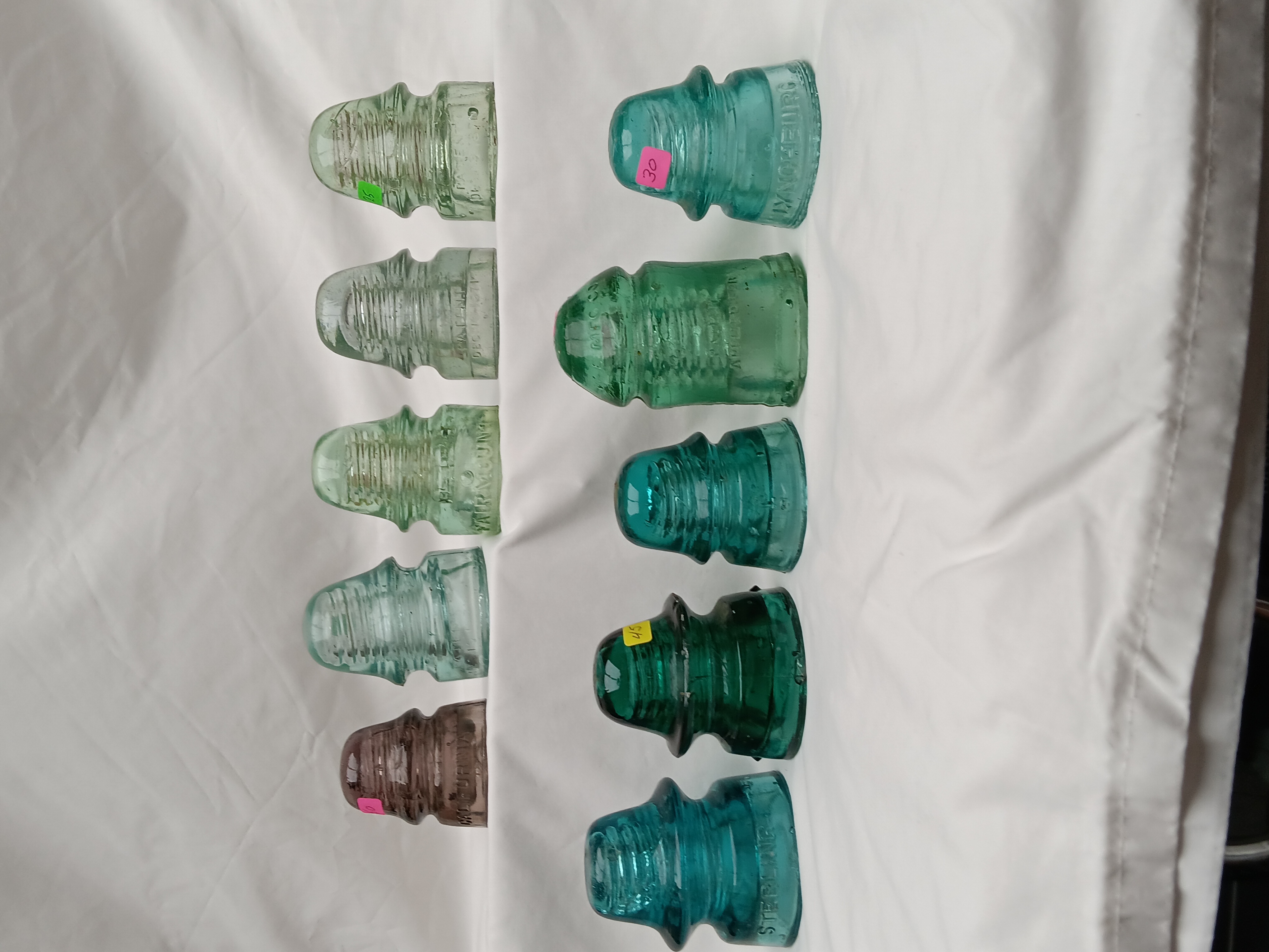 Back row left to right CD 160 california 1/2 inner skirt mark $45 CD 134 Dec Pat Good Shape $30 CD 134 Fairmount 1/2 base flake see 2nd pic. Lt Green $60 CD 134 Dec Pat Ice aqua Good Shape $30 CD 134 Dec Pat Factory skirt base hole Ice Green $25 Front row left to right Sterling 1/2 wire ring chip $45 Dot front Dot rear Rough edge on one side and base bubbles $45 cd 160 Sterling Good Shape 1/2 skirt facture below S $40 CD 126.4 Part of Base missing. See Pic Displays nice great color $50 CD 160 Lynchburg Good shape $30 Price plus shipping First E-Mail PayPal to my E-Mail address or check Thanks! Don |