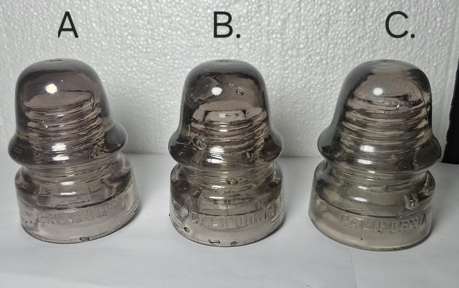 Here, I have three CD 161 Californias, all of which have "A" embossed domes. Time to weed out duplicates to make space. California is the epitome of color oddities. A. is a Dark-Smoke with a light plum tint. B. is Dark-smoke. It appears to have a purple tint in photos, but I don't see purple. And my daughters (with young 20/20 vision) agree - there's no purple tint. C. is a Medium-smoke with a definite gray tint. All excellent condition with usual issues such as annealing surface separation on threads, surface annealing cracks on dome, BB-peck, surface scratches on the domes, and wire scuffs on the skirt. I have detailed photos of all. Just ask and I can send via email. I take all payments (PayPal, zelle, venmo, check, etc). Whatever works for you. The Dark smoke color is often mistaken for purple, but it is not. The first solid smoke beehive I acquired long ago was sold as a purple. But it is just a great dark smoke and I loved it immediately; and since that time, I have hunted for the odd colors like dark-grays, off-clears, and dark-smoke for years in California, WGM, WFG, and HGCo. |