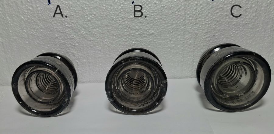Here, I have three CD 161 Californias, all of which have "A" embossed domes. Time to weed out duplicates to make space. California is the epitome of color oddities. A. is a Dark-Smoke with a light plum tint. B. is Dark-smoke. It appears to have a purple tint in photos, but I don't see purple. And my daughters (with young 20/20 vision) agree - there's no purple tint. C. is a Medium-smoke with a definite gray tint. All excellent condition with usual issues such as annealing surface separation on threads, surface annealing cracks on dome, BB-peck, surface scratches on the domes, and wire scuffs on the skirt. I have detailed photos of all. Just ask and I can send via email. I take all payments (PayPal, zelle, venmo, check, etc). Whatever works for you. The Dark smoke color is often mistaken for purple, but it is not. The first solid smoke beehive I acquired long ago was sold as a purple. But it is just a great dark smoke and I loved it immediately; and since that time, I have hunted for the odd colors like dark-grays, off-clears, and dark-smoke for years in California, WGM, WFG, and HGCo. |