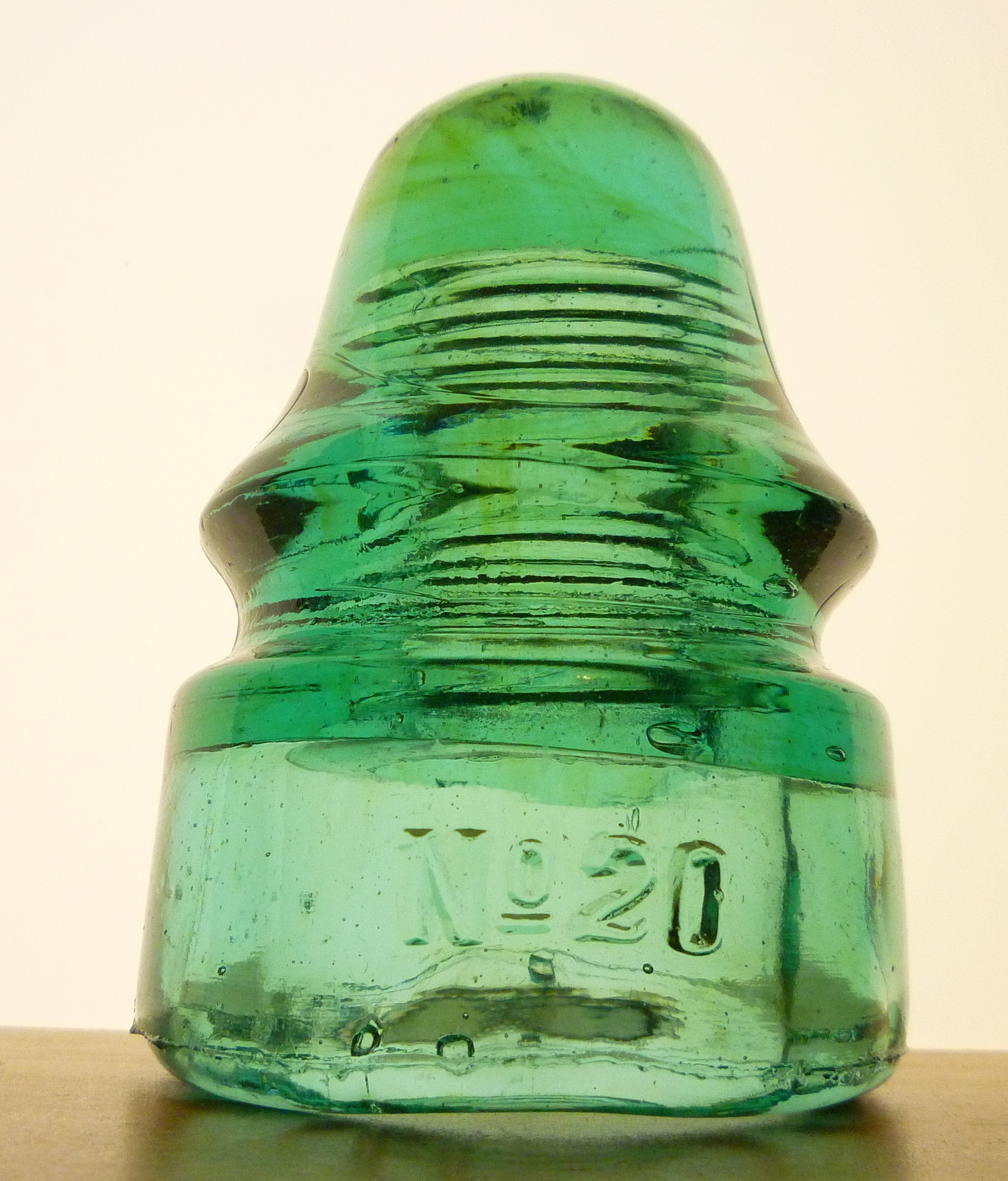 CD 133 No 20 signal insulator. Smooth base. GREEN with some light amber streaks in the dome glass.. Small open base bubble. No other distractions to note.