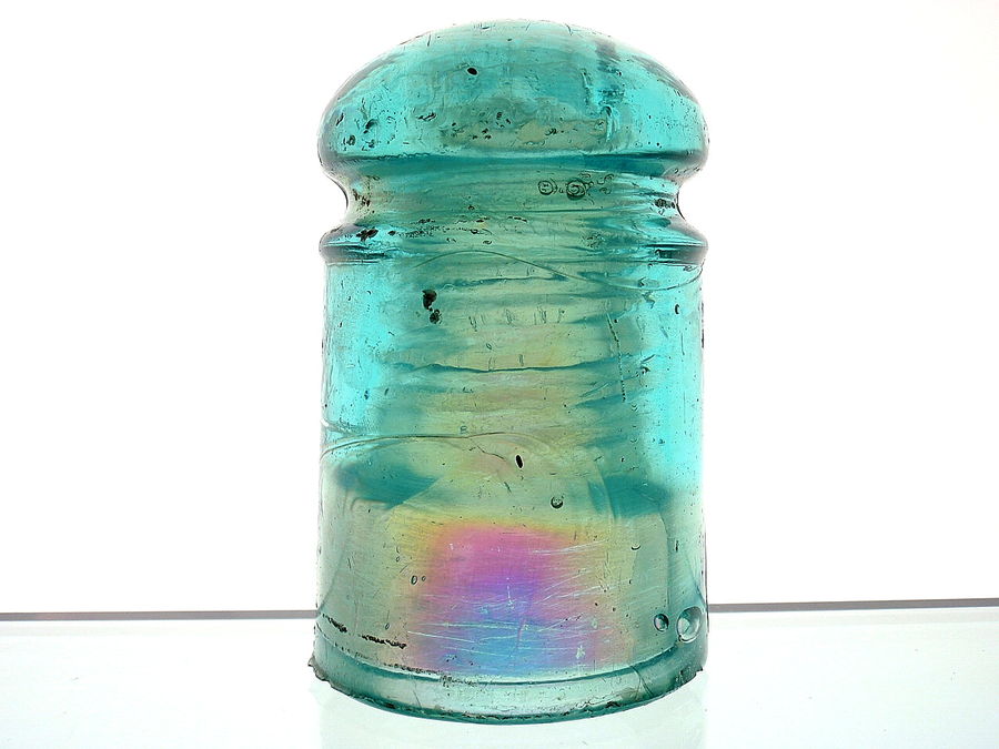 Awesome rainbow iridescence in this crown embossed WUTCO W BROOKFIELD oldie. Typical burial stain and pecks and a flat side base 1.0" flake is the damage report. $ 70.00 includes shipping.