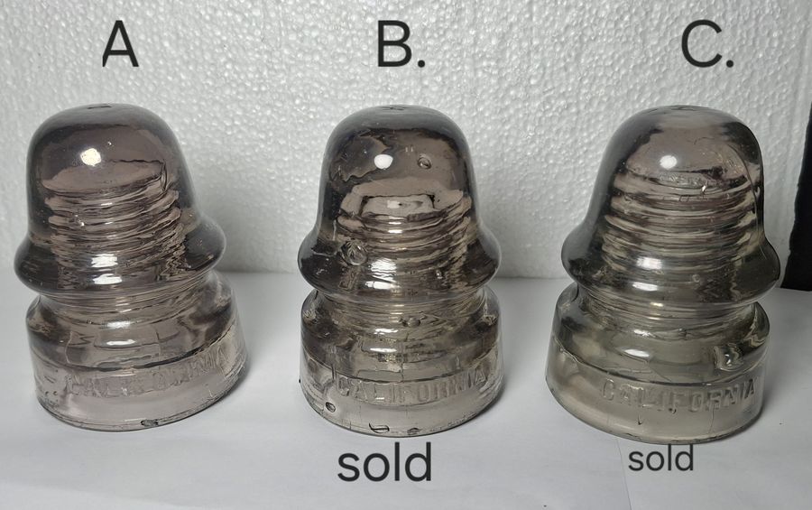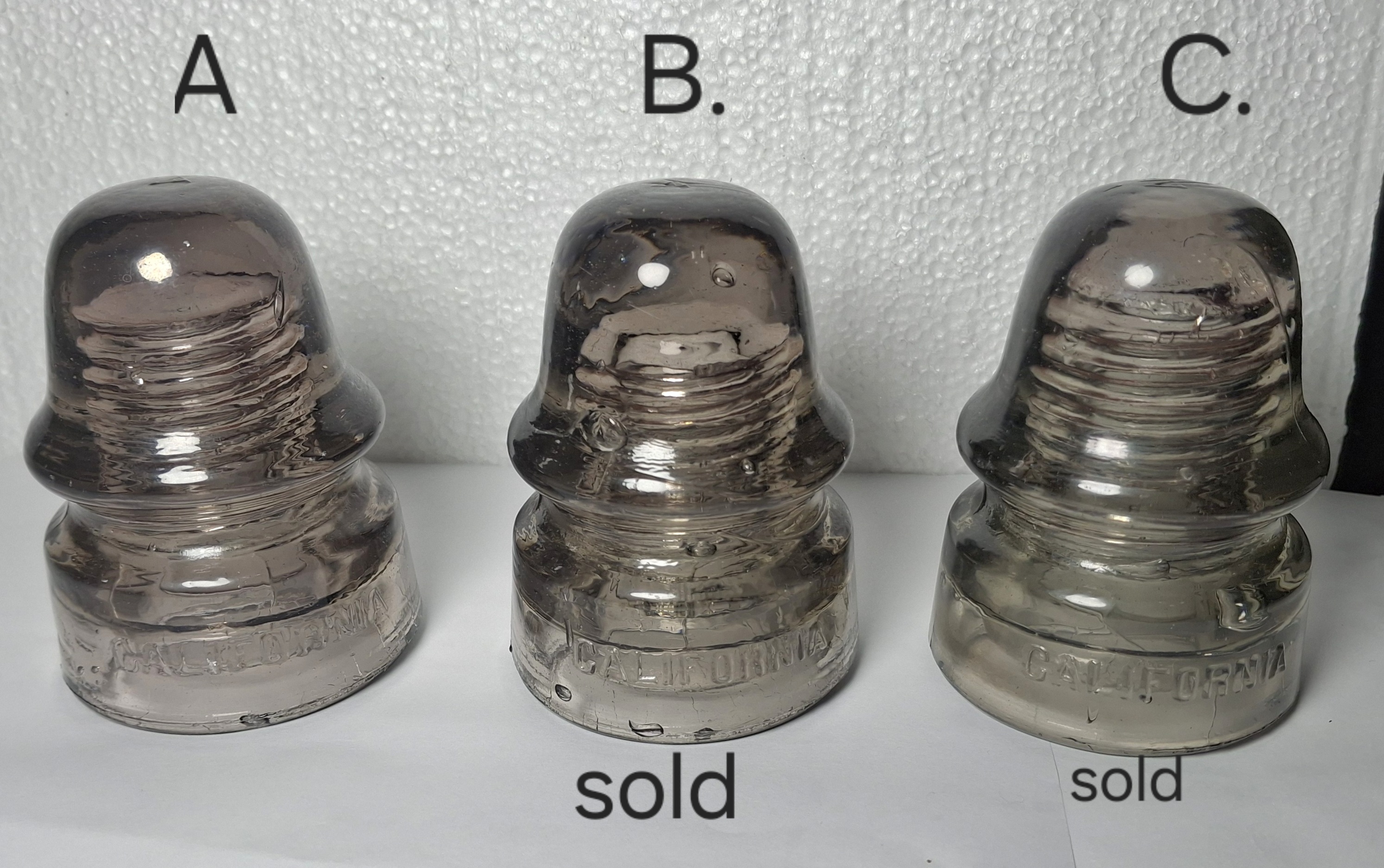 Here, I have three CD 161 Californias, all of which have "A" embossed domes. Time to weed out duplicates to make space. California is the epitome of color oddities. A. is a Dark-Smoke with a light plum tint. B. is Dark-smoke. It appears to have a purple tint in photos, but I don't see purple. And my daughters (with young 20/20 vision) agree - there's no purple tint. SOLD C. is a Medium-smoke with a definite gray tint. SOLD All excellent condition with usual issues such as annealing surface separation on threads, surface annealing cracks on dome, BB-peck, surface scratches on the domes, and wire scuffs on the skirt. I have detailed photos of all. Just ask and I can send via email. I take all payments (PayPal, zelle, venmo, check, etc). Whatever works for you. |
