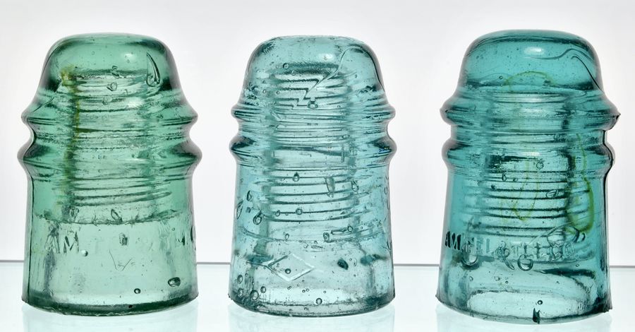 LEFT: Am Tel & Tel EIN 135. There is a nice tear shaped bubble in the front crown and a nice amber streak toward the left mold line from the dome to the wire groove. It has a beautiful profile similar to WGMs and other Denver glass; I guess that is why it has had that nick name for the 20 years that I have been in the hobby. Damage consists of a half pinky nail size clam shell chip (back skirt) and a bb ping with a white halo to the lower crown above Co. I have owned several of these and this is about as green as they get. Many might call it green aqua. $60 plus shipping. I am also willing to trade this for the wider Denver EIN053 with comparable character.