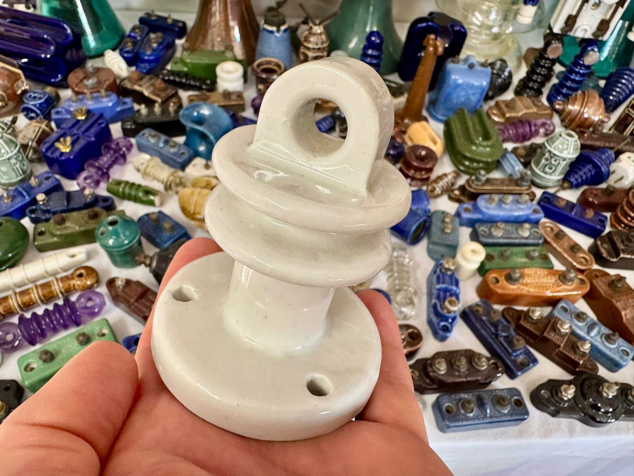 This oddball porcelain insulator has been sitting on a shelf behind the counter of an antique store for years and was NFS every time I asked about it. My wife finally convinced them to sell it. I'm guessing it's possibly a foreign radio standoff. James Lindsey told me it was made by the Cook pottery company which operated in Trenton, NJ from 1894 to 1929. They made lots of electrical porcelain insulators including tubes, knobs and standoffs |
