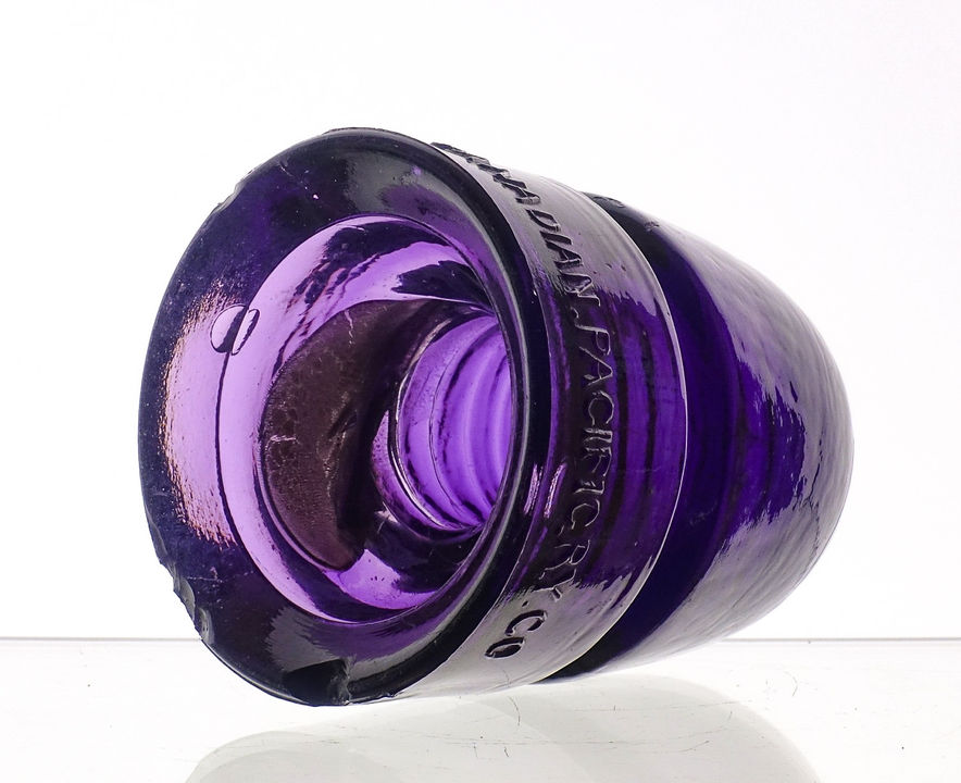 Royal purple CD 143 Canadian Pacific beehive with a huge carbon bubble in the rear skirt. This is the older version with the MLOD. Unfortunately, the bubble is somewhat hard to see due to the dark color of the glass, but still shows well in a back-lit case. The condition is decent; there are a couple base chips that can be seen in the photo, a couple of which are fairly small, and a few scattered dings. Asking $135 plus shipping. |