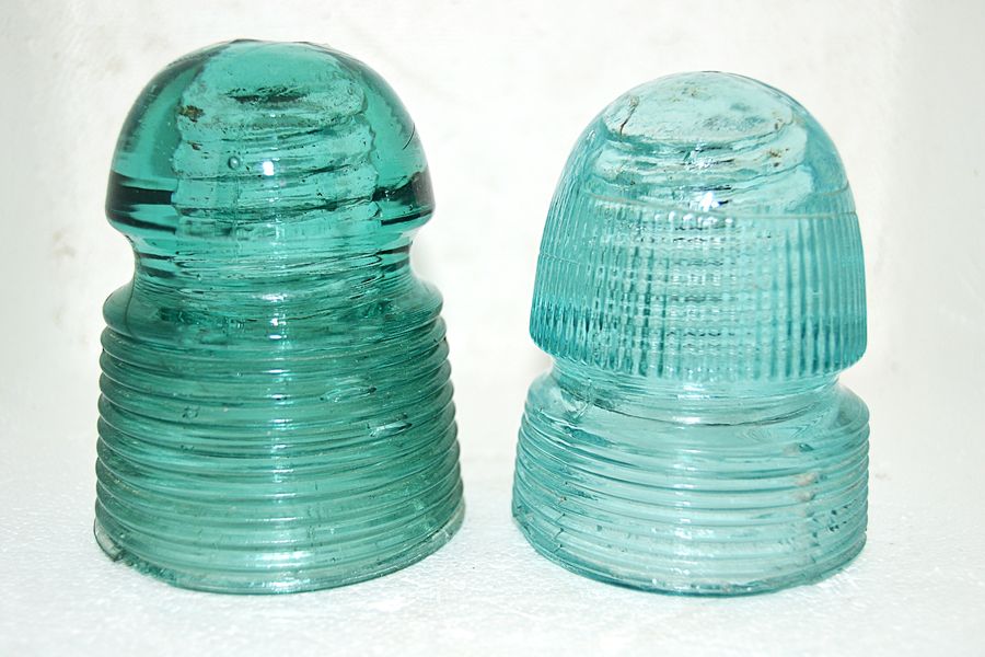 Left is a CD 144 No Name - Inside skirt has horizon ridges - Blue Aqua - Several ridges have damage mostly on base - $185 --- CD 143 Withycombe - Embossed Canadian Pacific R.R Co. - Several ridges on bottom has some roughness - $130 Plus shipping - Back and base view on following posts |