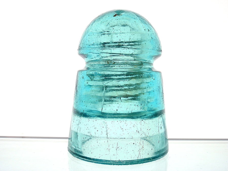 Unlisted in the price guide. CD 104 base embossed NATIONAL INSULATOR CO PAT JAN 1 & OCT 7 1884 with a indented rectangle in the top of the pinhole baby beehive in a very blue aqua. Matchead size flake on the crown, 1.0" skirt crack and a 7/8" flat base flake that gets "OR CO" of the embossing is the damage report. $ 265.00 includes shipping. |