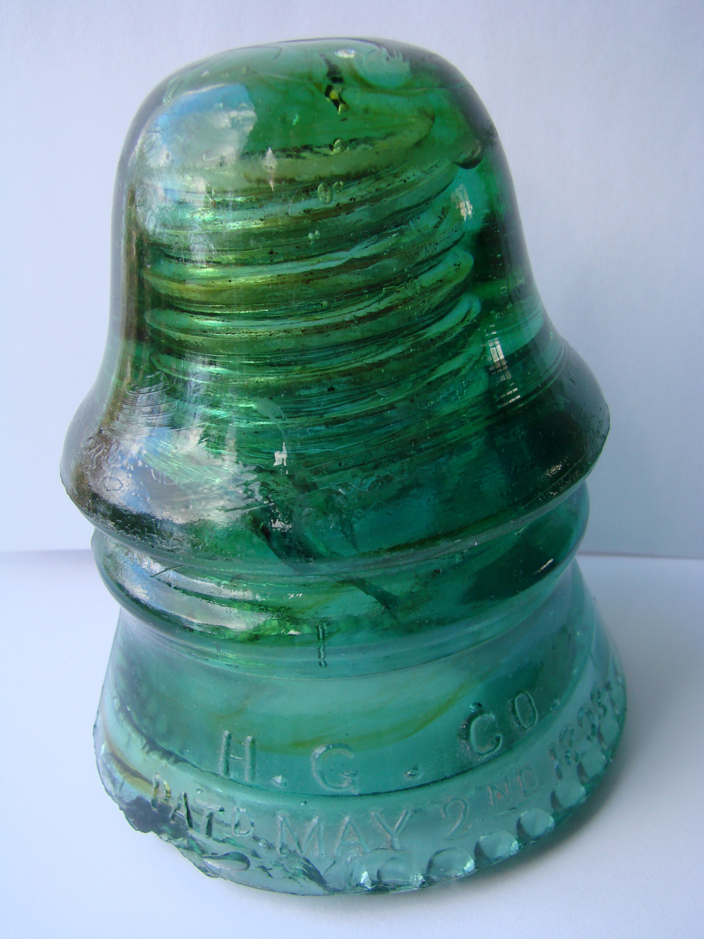 CD 151 { front skirt} H.G.CO. / PATd MAY 2nd 1893 {rear skirt} PETTICOAT . Has a nice saturated Yellow Green top with amber undertones swirling down. Has 6 missing drips and an x shaped internal crack. {see pics} One of a kind piece. $825. + postage. |