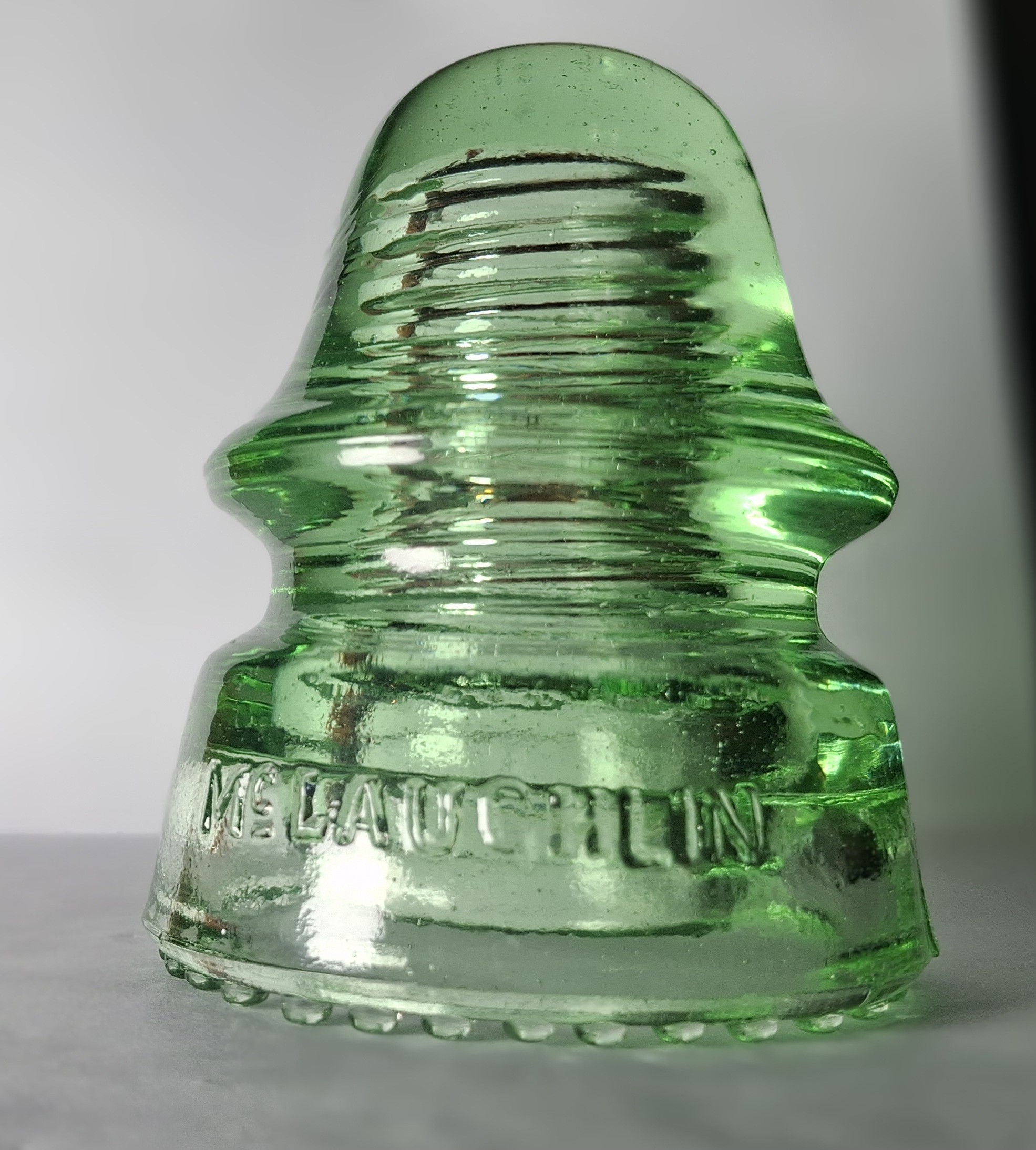 This one glows, and it is one of my favorite colors. It is a CD 162 McGlaughlin No 19. The two main photos were taken in 5000 K LED light. And to be fair, I took another photo under my normal desk lamp for color comparison. As for the condition, the only flaw I see is a tiny chip on the upper wire ridge, the size of a very small pencil tip. It is located on the side of the insulator 3/4 inch away from the mold line at the middle of the insulator. I will sell this one shipped via Priority Mail to your door for $140. |