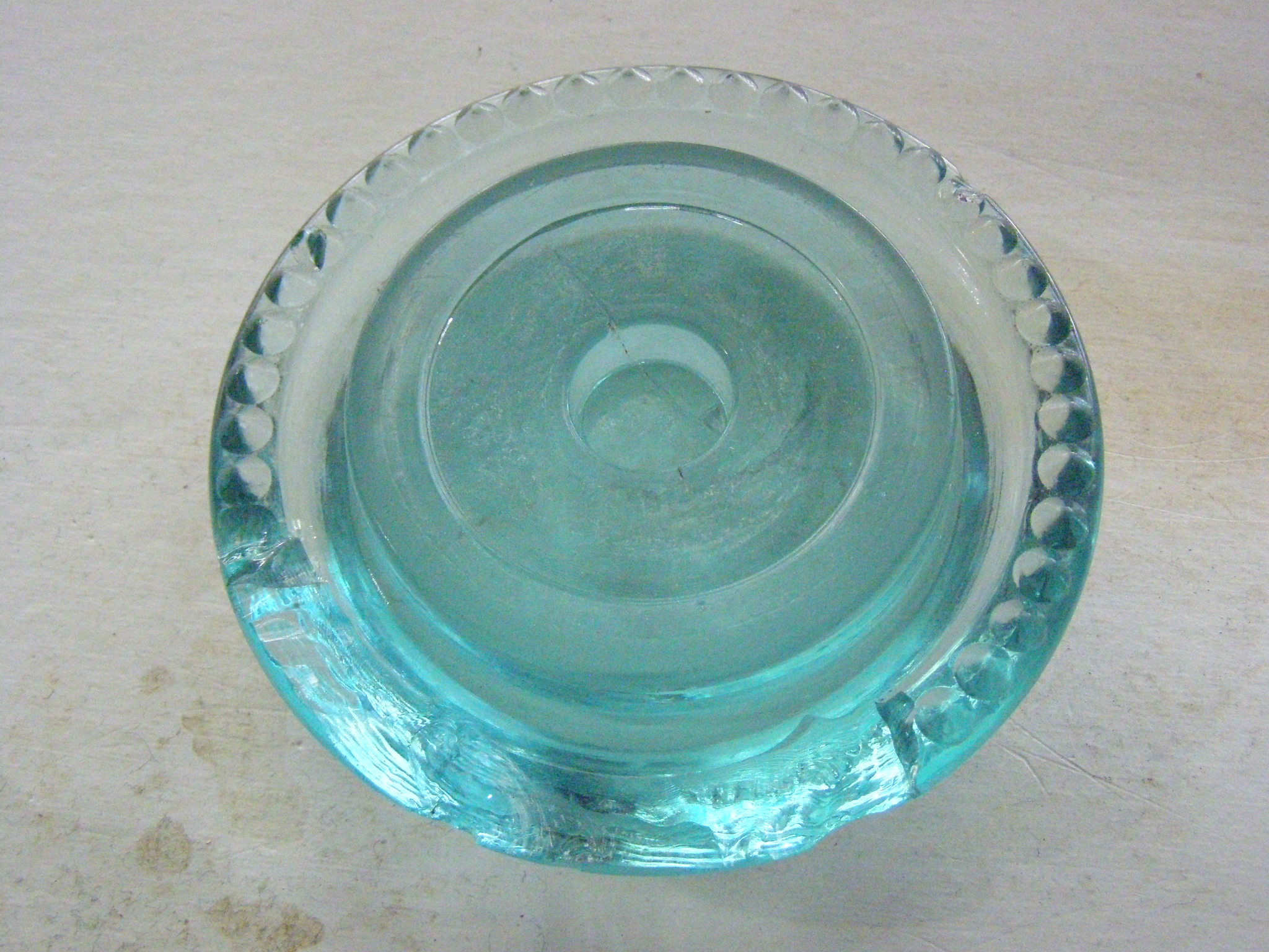 Light aqua battery rest. (F-Skirt embossing) HEMINGRAY (R-Skirt embossing) PATENT MAY 2 1893. That is the patent date for Drip Points (Patent No. 496,652). No CD number has been assigned to this yet. 6" x 1 ⅞" (152mm X 47mm). Fat drip points. Top wear and bottom wear. 4-3/4" chipping on on the outer skirt., 2 other chipped drip points. One of these other chipped drip points has an associated 3/8" x 1/8" chip on the outside edge. 1/8" flake on the outside edge. The one I own has about the same amount of damage $2000 postpaid. Seven of these are known and the other six are locked in collections that will be there for many more years. Hemingray battery rest, no CD assigned yet, $2000 postpaid. NOTE: I revised this listing shortly after posting it to note some additional damage.