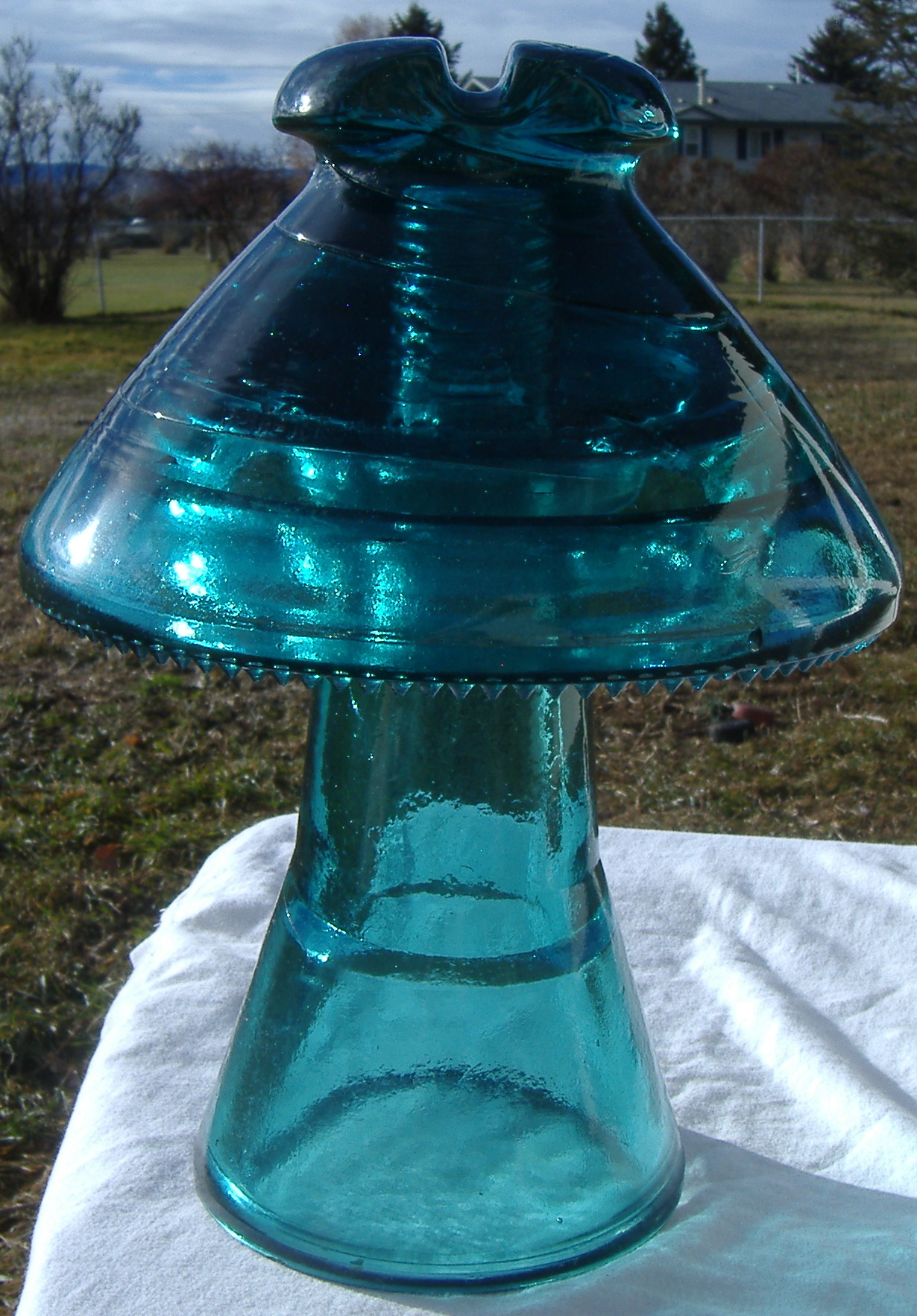 This insulator is a CD 304 top and a CD 310 base that is known as a Coolie Hat. It has faint pressed in embossing; Hemingray Patent May 2 1893. The insulator is a blue aqua color that is strong on the blue side. It is in very near mint condition with the top having 4 drips with flakes off them. A beautiful displaying piece. Priced at $235.00 plus USPS Ground Advantage shipping cost. (about $30.00). Thanks. |
