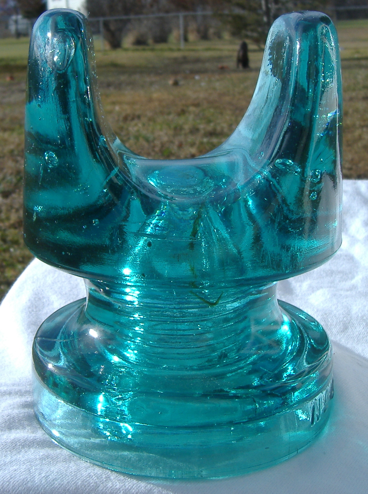 This insulator is a CD 267 embossed; No 4 Cable. It is an aqua color. The insulator is in very near mint condition with only a factory 3/4" open base edge bubble on the right hand side. It has some bubbles in the glass on the top area. A nice displaying power piece. Priced at; $200.00 plus USPS Ground Advantage shipping cost. Thanks. |