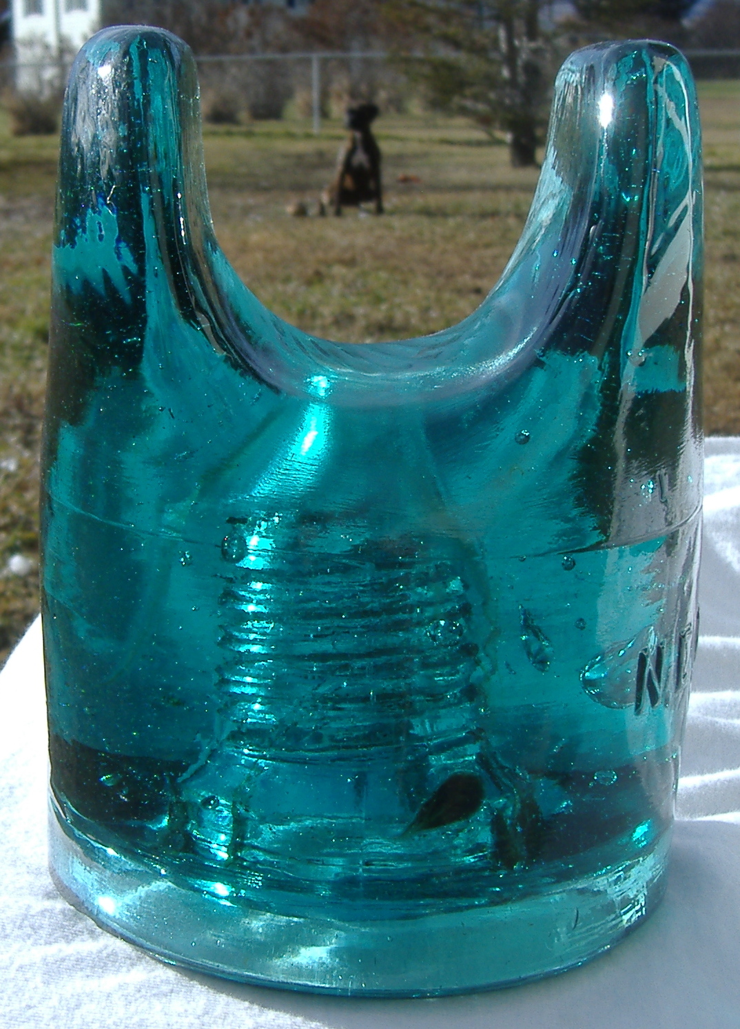 This insulator is a CD 267.5 embossed; N.E.G.M. CO. known as a straight sides. It is a blue aqua color with a milky streak in the glass and an amber pollywog. The insulator is in near mint condition with wire wear in the wire groove, a 3/4" long shallow wear mark on the base edge on the embossed side, and a factory inner skirt bubble with dirt inside. A very nice displaying insulator with character. Priced at; $225.00 plus USPS Ground Advantage shipping cost. Thanks. |