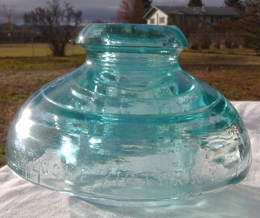 This insulator is a CD 286 embossed on the front; F. M. Locke Victor N. Y. and 5 patents on the back It is a light blue color. The insulator is in near mint condition with only a 5/8" thin flat inner skirt flake. A very nice looking flat top power piece. Priced at; $50.00 plus USPS Ground Advantage shipping cost. Thanks. |